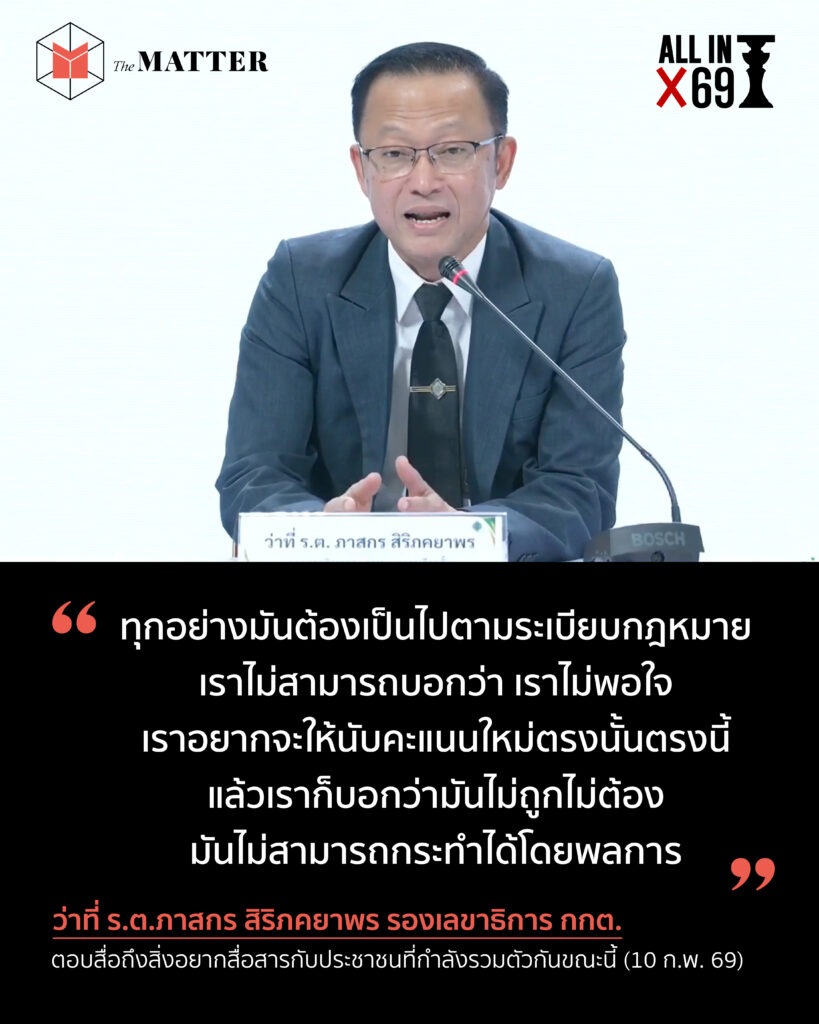 “ผมเชื่อว่าทุกเรื่อง เมื่อเข้าสู่กระบวนการของคณะกรรมการการเลือกตั้ง เราให้ความเป็นธรรม และคณะกรรมการการเลือกตั้งให้ความสำคัญกับทุกเรื่องที่เข้าสู่กระบวนการแน่นอนครับ อยากให้ท่านสบายใจ” ว่าที่ ร.ต.ภาสกรกล่าว