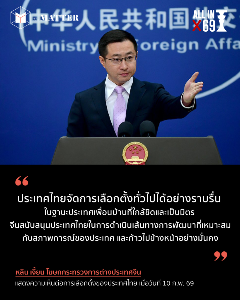 หลิน เจี้ยน โฆษกกระทรวงการต่างประเทศจีน แสดงความเห็นต่อการเลือกตั้งของประเทศไทยว่า ประเทศไทยจัดการเลือกตั้งทั่วไปได้อย่างราบรื่น ในฐานะประเทศเพื่อนบ้านที่ใกล้ชิดและเป็นมิตร จีนสนับสนุนประเทศไทยในการดำเนินเส้นทางการพัฒนา ที่เหมาะสมกับสภาพการณ์ของประเทศ และก้าวไปข้างหน้าอย่างมั่นคง จีนพร้อมที่จะทำงานร่วมกับประเทศไทยเพื่อกระชับความร่วมมือและสร้างรากฐานของประชาคมจีน-ไทยที่มีอนาคตร่วมกันเพื่อประโยชน์ของประชาชนทั้งสองประเทศ