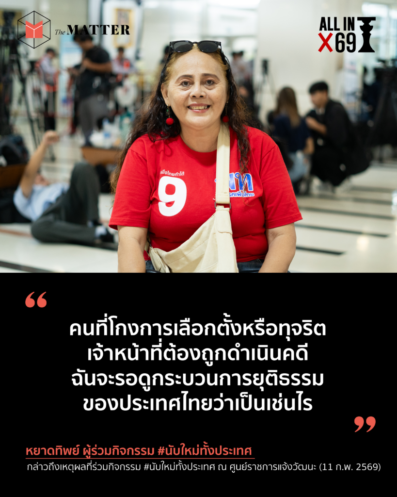 หยาดทิพย์ ผู้เข้าร่วมกิจกรรม อายุ 62 ปี มั่นใจว่าการเลือกตั้งครั้งนี้มีการ “โกง” เกิดขึ้น จากเหตุการณ์ในช่วงหลายวันที่ผ่านมา ไม่ว่าจะเป็นการนับคะแนนที่ไม่โปร่งใส ใบคะแนนถูกทิ้งลงถังขยะ กรอกคะแนนผิด บัตรเขย่ง หีบไม่ถูกรัดด้วยเคเบิลไทร์