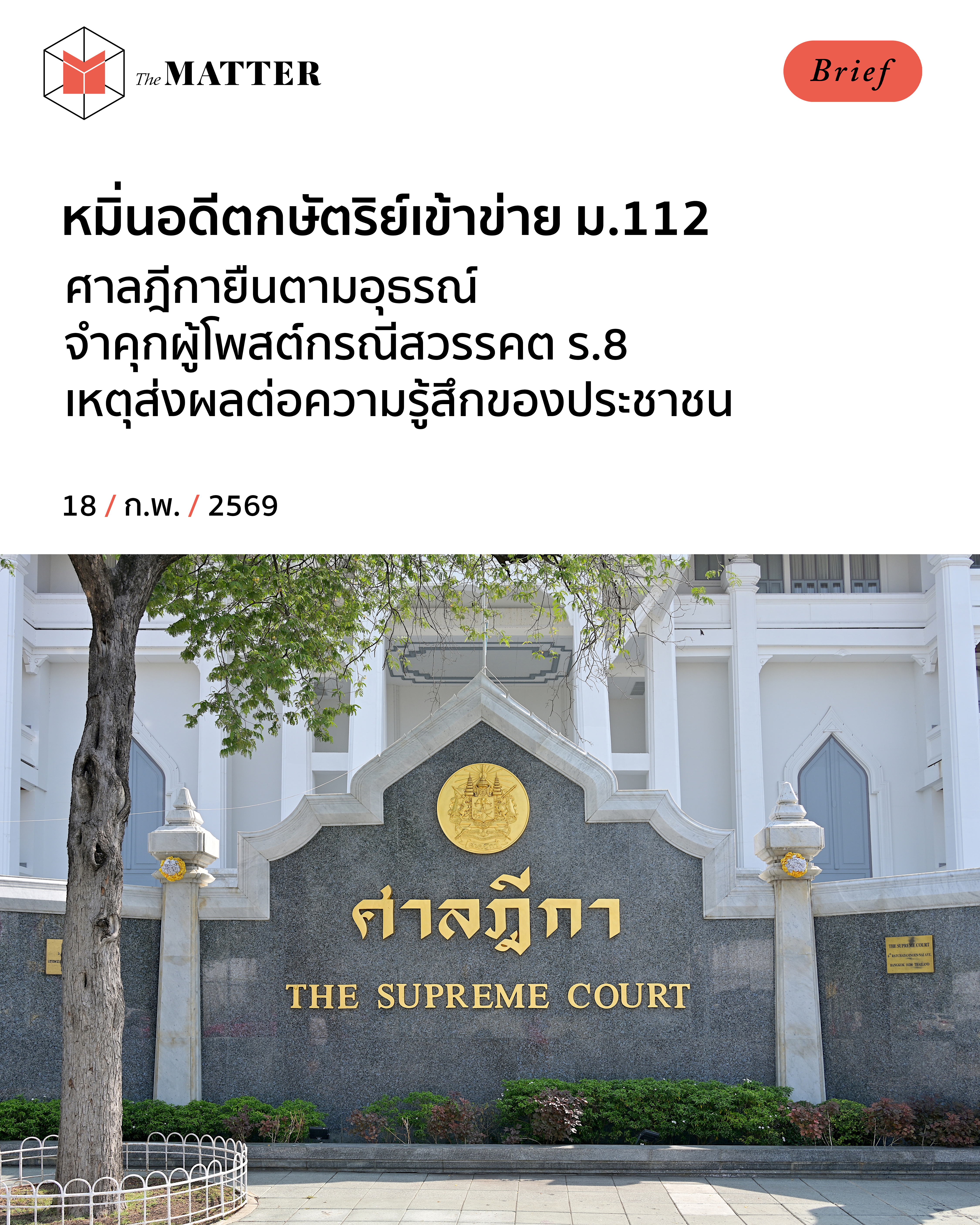 วันนี้ (18 กุมภาพันธ์ 2569) วุฒิภัทร (นามสมมติ) ถูกศาลฎีกาพิพากษาชี้ขาดความผิด ม. 112 กรณีโพสต์แสดงความคิดเห็นเกี่ยวกับการสวรรคตของ ร.8 เมื่อปี 2563 ลงโทษจำคุก 3 ปี 4 เดือน ไม่รอลงอาญา