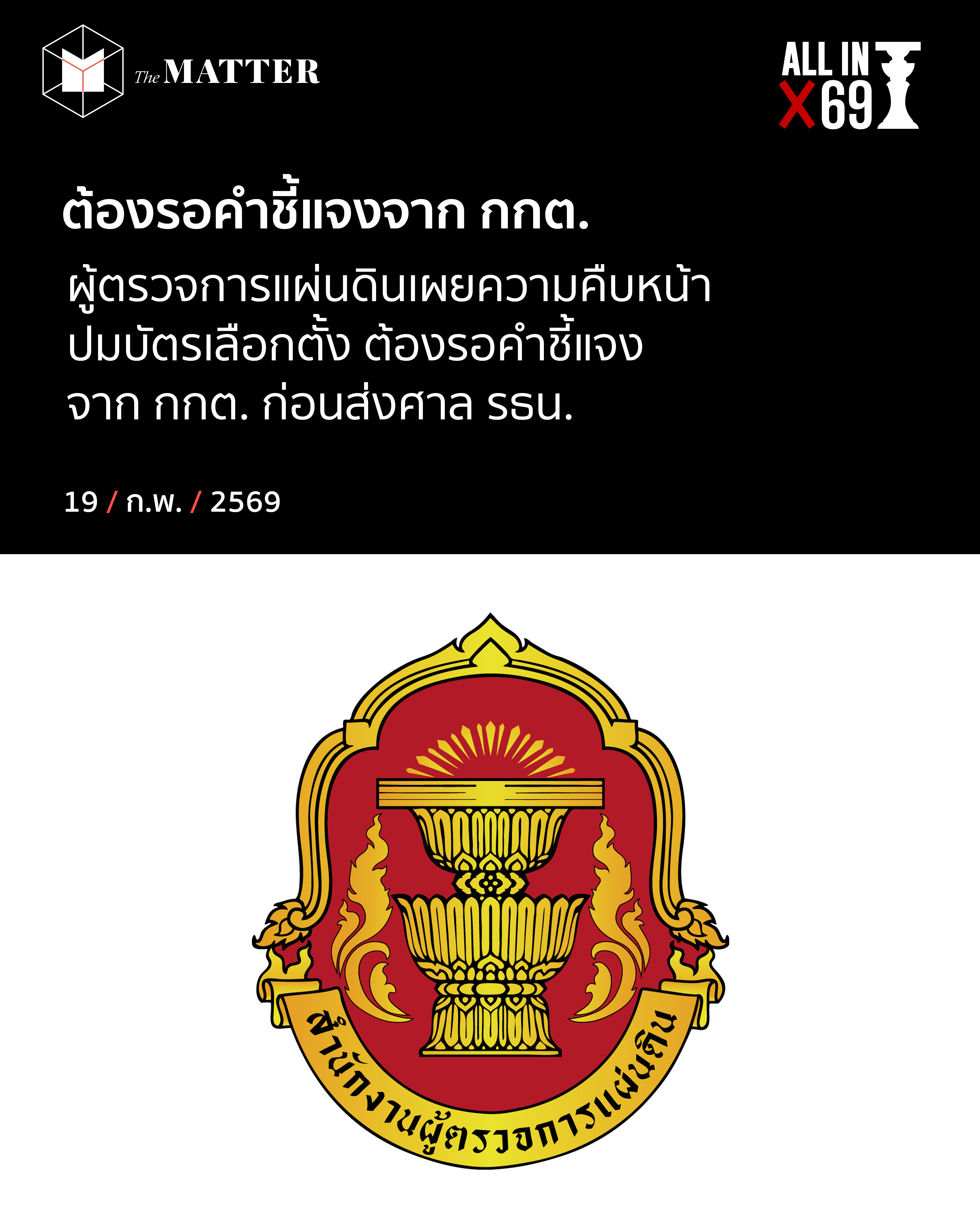 ล่าสุด วันนี้ (19 กุมภาพันธ์ 2569) ที่สำนักงานผู้ตรวจการแผ่นดิน พล.ต.อ.สรายุทธ สงวนโภคัย ผู้ตรวจการแผ่นดิน ได้เปิดเผยความคืบหน้าเกี่ยวกับการพิจารณาคำร้องคดีจากภาคประชาชนเกี่ยวกับกรณีการจัดการเลือกตั้งครั้งล่าสุด