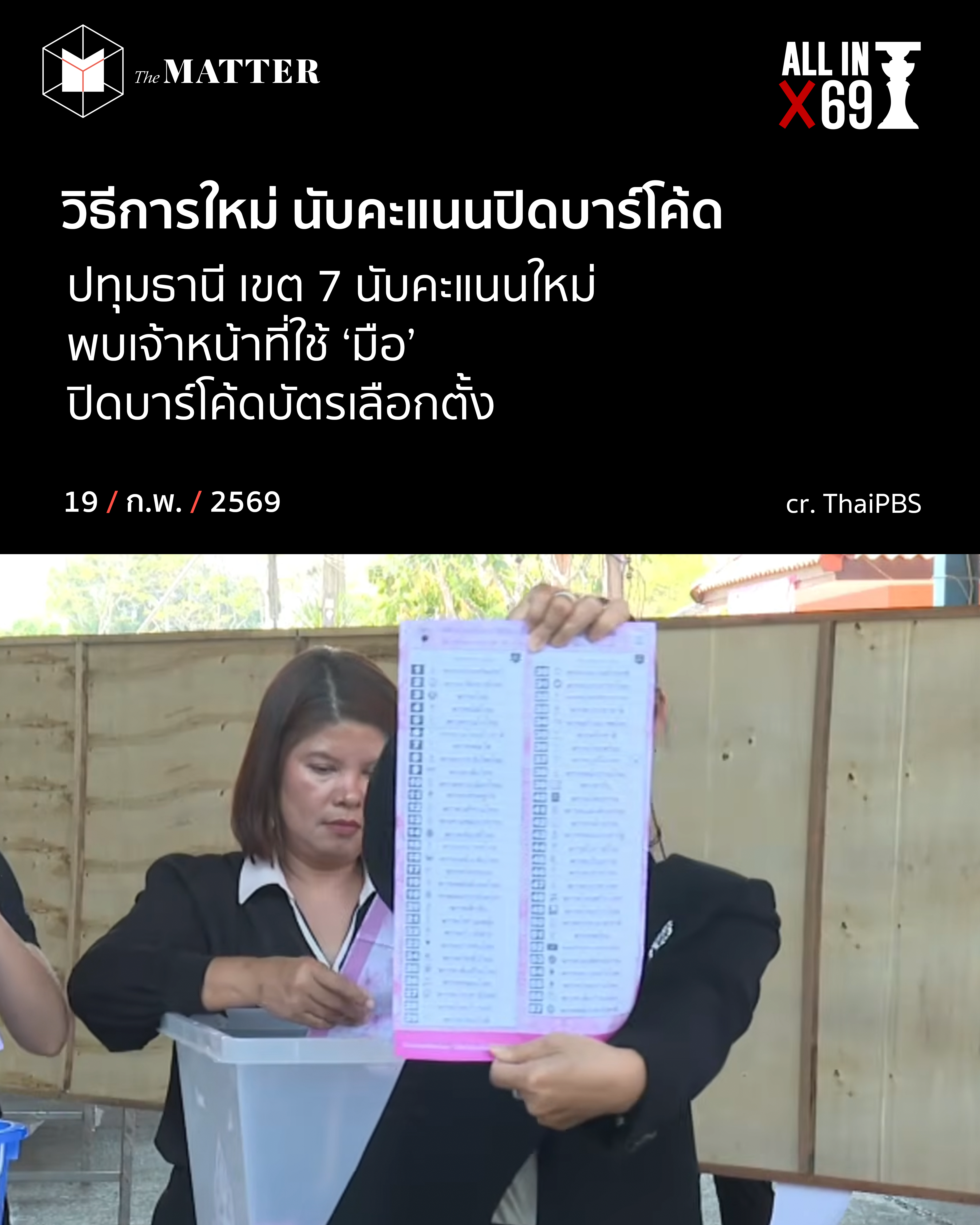 จากกรณีที่มีคนสังเกตว่าบัตรเลือกตั้งสีชมพูซึ่งมีบาร์โค้ดระบุอยู่ด้านล่างทำให้สืบถึงต้นขั้วและข้อมูลของผู้ลงคะแนนได้ การนับคะแนนใหม่ ณ เขตเลือกตั้งปทุมธานี เขต 7 วันนี้ ได้มีเจ้าหน้าที่ใช้มือบังบาร์โค้ดดังกล่าว