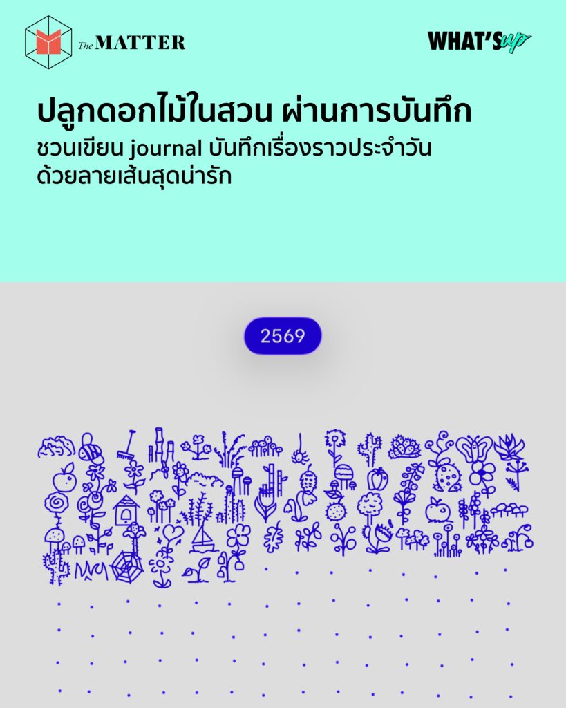 นอกจากลายเส้นสุดน่ารักแล้ว แอปพลิเคชั่นยังออกแบบมาให้บันทึกประจำวันเป็นเรื่องง่ายขึ้น ด้วยฟีเจอร์ที่ไม่ซับซ้อน หน้าแรกเราจะเห็นภาพรวมทั้งปี ไอคอนพืชพรรณธรรมชาติจะปรากฏขึ้นในวันที่ผ่านมาแล้วแบบไม่ซ้ำกัน ดังนั้นยิ่งแต่ละวันผ่านไปมากเท่าไหร่ สวนของเราก็จะค่อยๆ ใหญ่และหลากหลายขึ้นเท่านั้น และหน้าต่อมาคือรายละเอียดบันทึกที่เราเขียนไปแต่ละวัน