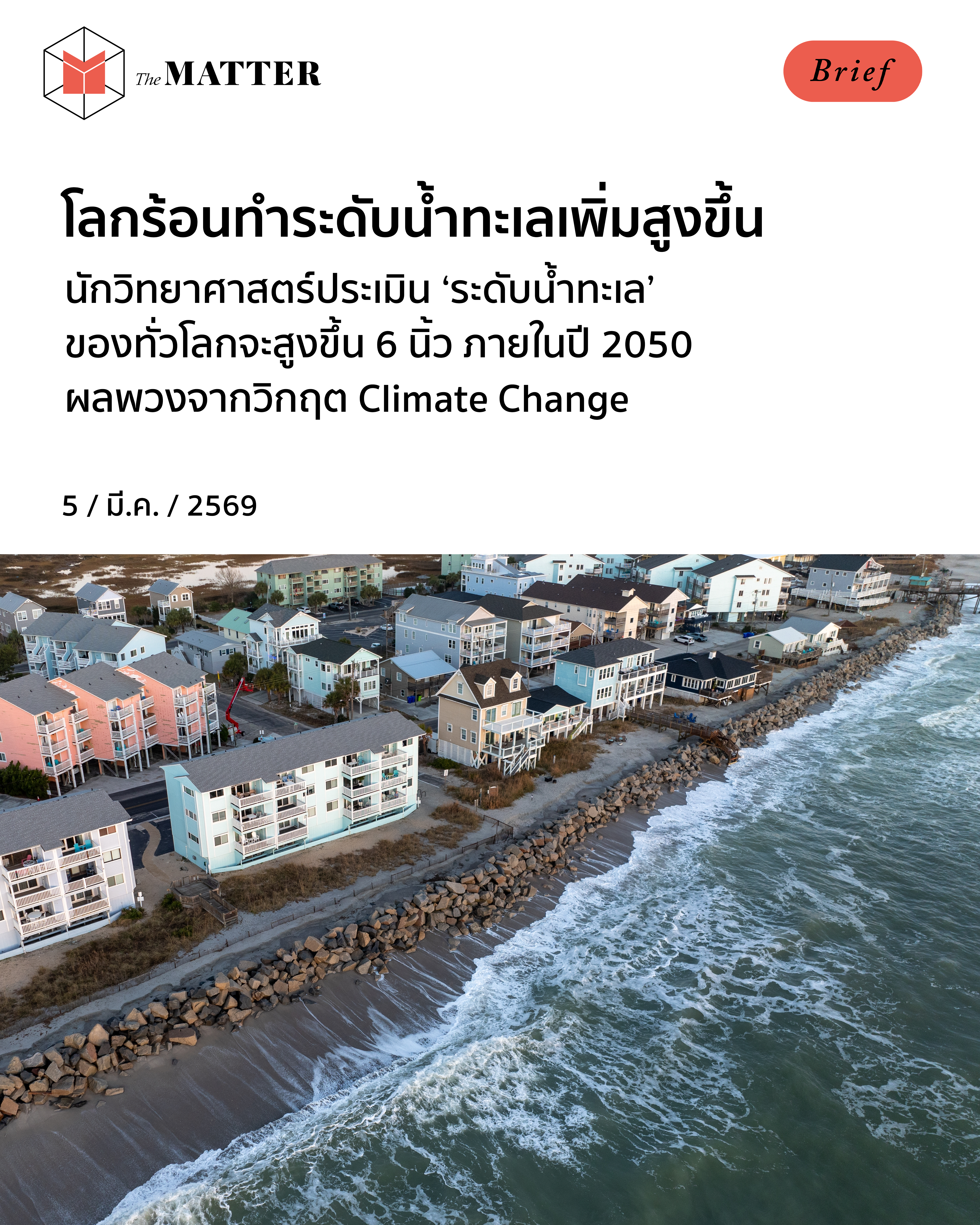 ไม่ใช่แค่ ‘ความร้อน’ ที่เป็นผลพวงมาจากวิกฤตสภาพภูมิอากาศ แต่ ‘ระดับน้ำทะเล’ ที่เพิ่มขึ้น ก็เป็นอีกหนึ่งผลกระทบที่ชัดและน่าตกใจเช่นกัน และล่าสุดนักวิทยาศาสตร์ประเมินว่าระดับน้ำทะเลทั่วโลกจะเพิ่มขึ้นถึง 6 นิ้ว ภายในปี 2050
