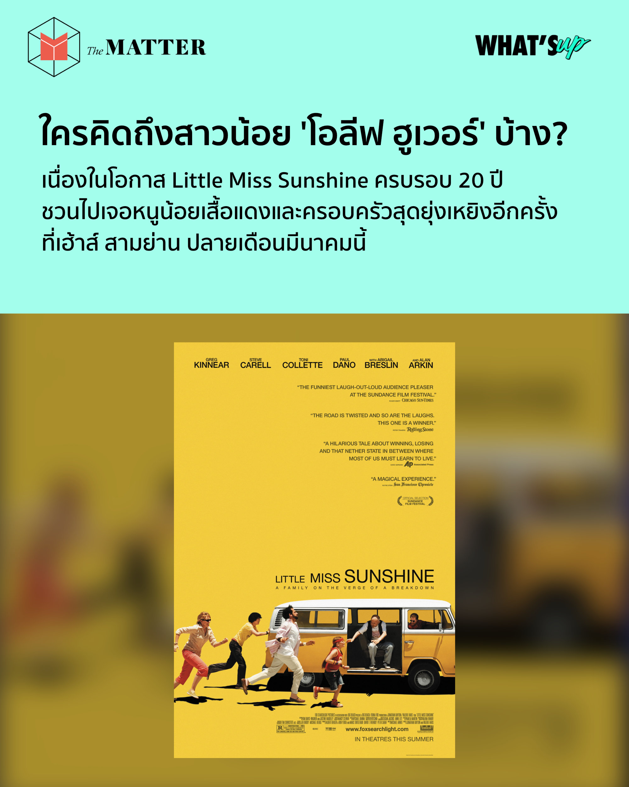 เผลอไม่ทันไร Little Miss Sunshine หนังคอเมดี้สุดฮีลใจของใครหลายคน กำลังจะครบรอบ 20 ปีแล้ว และในวาระนี้นี่เอง เฮ้าส์ สามย่าน โรงหนังนอกกระแสจึงหยิบเรื่องราวของคนขี้แพ้กับรถโฟล์กสีเหลืองสดกลับมาฉายบนจอใหญ่ให้เราได้หายคิดถึงกันอีกครั้ง