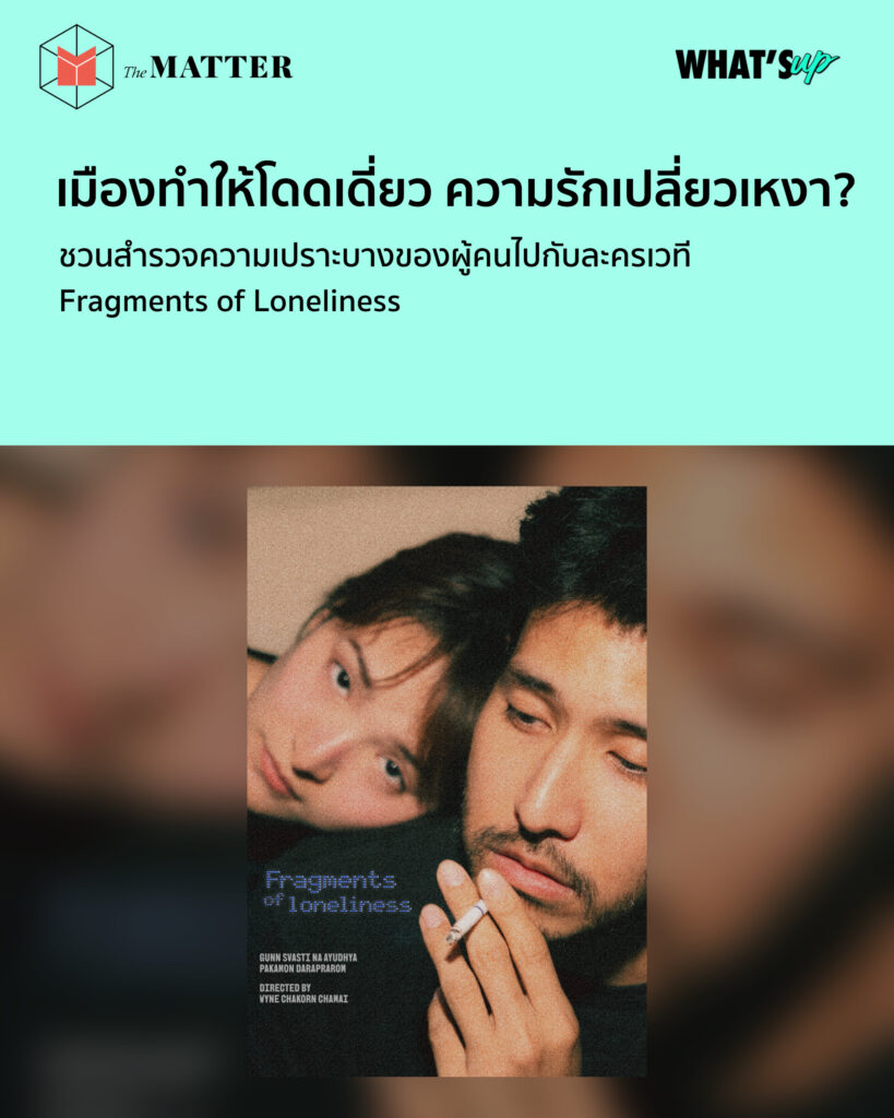 Fragments of Loneliness คือละครเวทีที่ชวนไปสำรวจความเหงา ความรัก และความโดดเดี่ยวของผู้คนที่อาศัยอยู่ในเมือง ผ่านตัวละครทั้ง 2 ชีวิตในอพาร์ตเมนต์ที่พยายามปะติดปะต่อเศษเสี้ยวความรู้สึก ณ ขณะที่ความสัมพันธ์กำลังพังทลายลง โดยมีกรรณ—สวัสดิวัตน์ ณ อยุธยา และ แซน—ภคมน ดาระปรารมภ์ นำแสดง