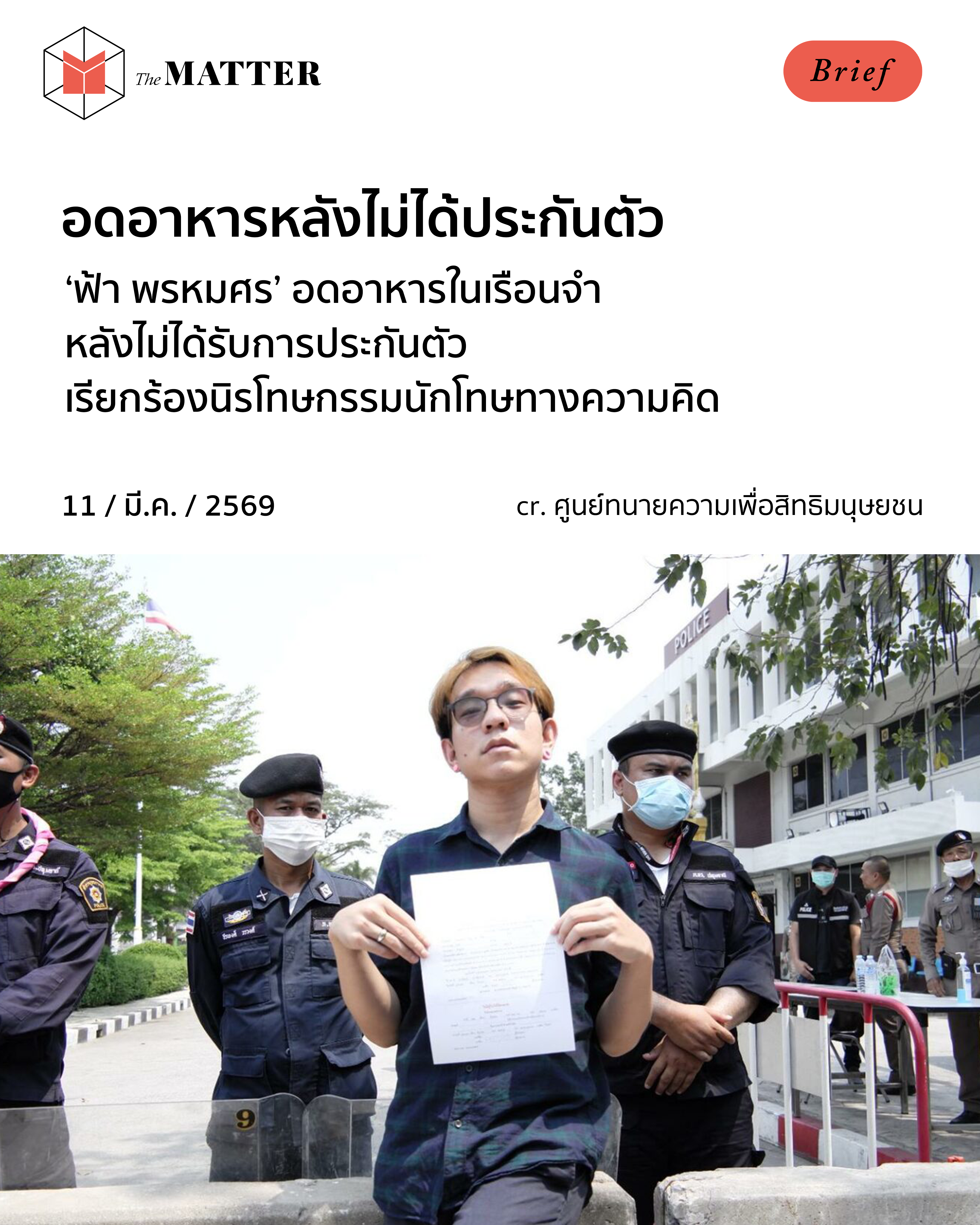 ‘ฟ้า’ พรหมศร วีระธรรมจารี นักกิจกรรมกลุ่มราษฎรมูเตลู อดอาหารอีกครั้ง หลังจากที่ศาลอุทธรณ์ภาค 1 มีคำพิพากษายืนจำคุก 2 ปี 10 เดือน ในคดีข้อหาหลักตามมาตรา 112 จากกรณีทำกิจกรรมเรียกร้องให้ปล่อยตัว สิริชัย นาถึง เมื่อปี 2564