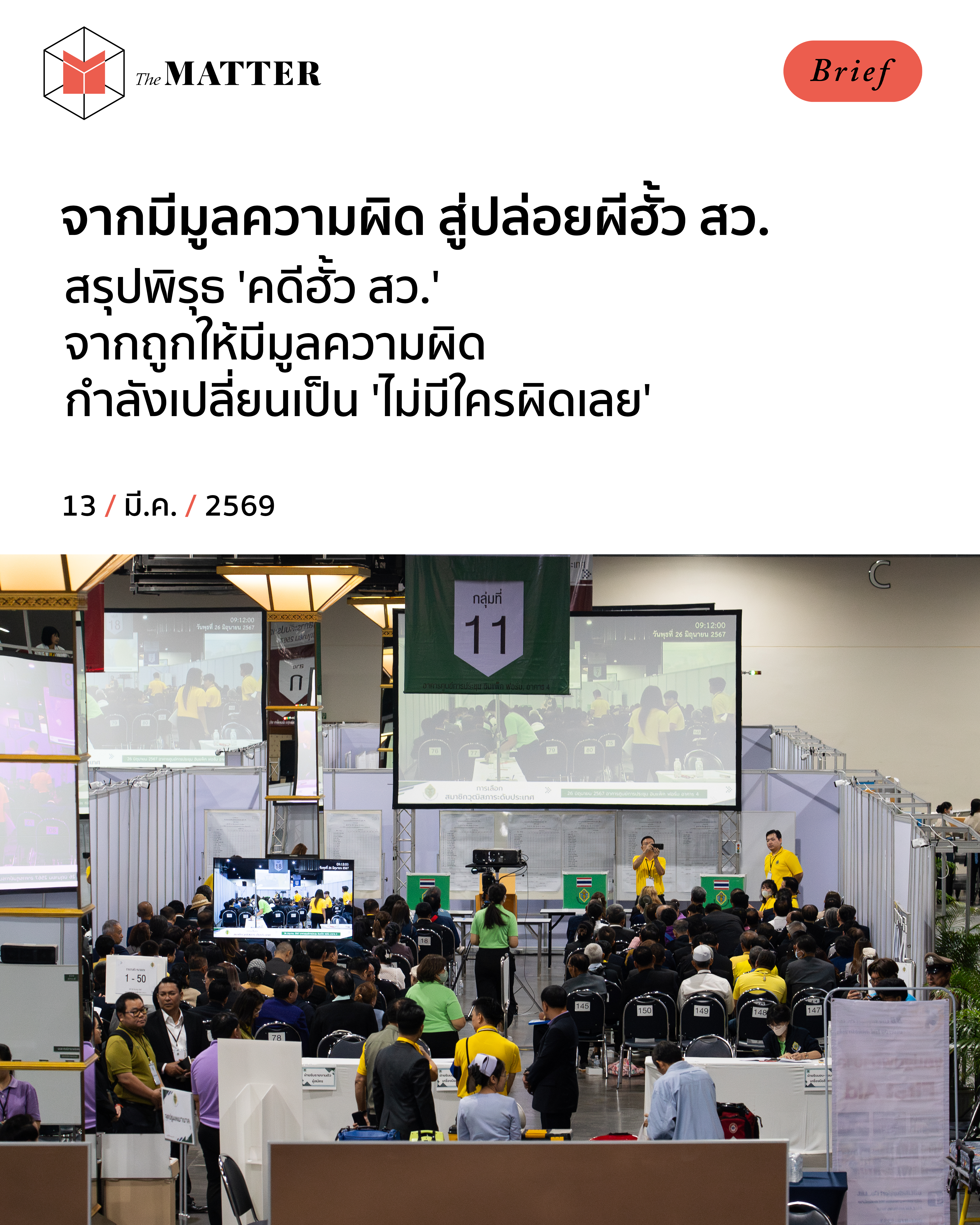 เมื่อวาน (12 มีนาคม 2569) มีรายงานข่าวจากสำนักงานคณะกรรมการการเลือกตั้ง (กกต.) เปิดเผยความคืบหน้าเกี่ยวกับคดีทุจริตการเลือกสมาชิกวุฒิสภา หรือ ‘คดีฮั้ว สว.’ โดยคณะอนุกรรมการวินิจฉัยชี้ขาดปัญหาข้อโต้แย้ง คณะที่ 36 ว่ามีมติเสียงข้างมาก 5:2 ให้ผู้ถูกกล่าวหา 229 ราย ไม่มีมูลความผิดในคดีฮั้ว สว. ก่อนเตรียมนำเสนอมติเข้าสู่ที่ประชุม กกต. เพื่อพิจารณาประกาศผลอย่างเป็นทางการ