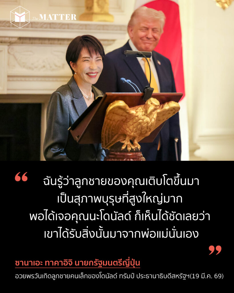 ขณะที่ในช่วงหนึ่งของงานเลี้ยงมื้อค่ำที่ทำเนียบขาว เพื่อต้อนรับทาคาอิจิ พร้อมกระชับพันธมิตรญี่ปุ่น-สหรัฐฯ นายกฯ ญี่ปุ่นก็ได้กล่าวอวยพร(?) บาร์รอน ทรัมป์ ลูกชายคนเล็กของทรัมป์ และสุภาพสตรีหมายเลขหนึ่ง เมลาเนีย ทรัมป์ เนื่องในวันคล้ายครบรอบวันเกิด 20 ปีของเขา หรือวันที่ 20 มีนาคมนั่นเอง