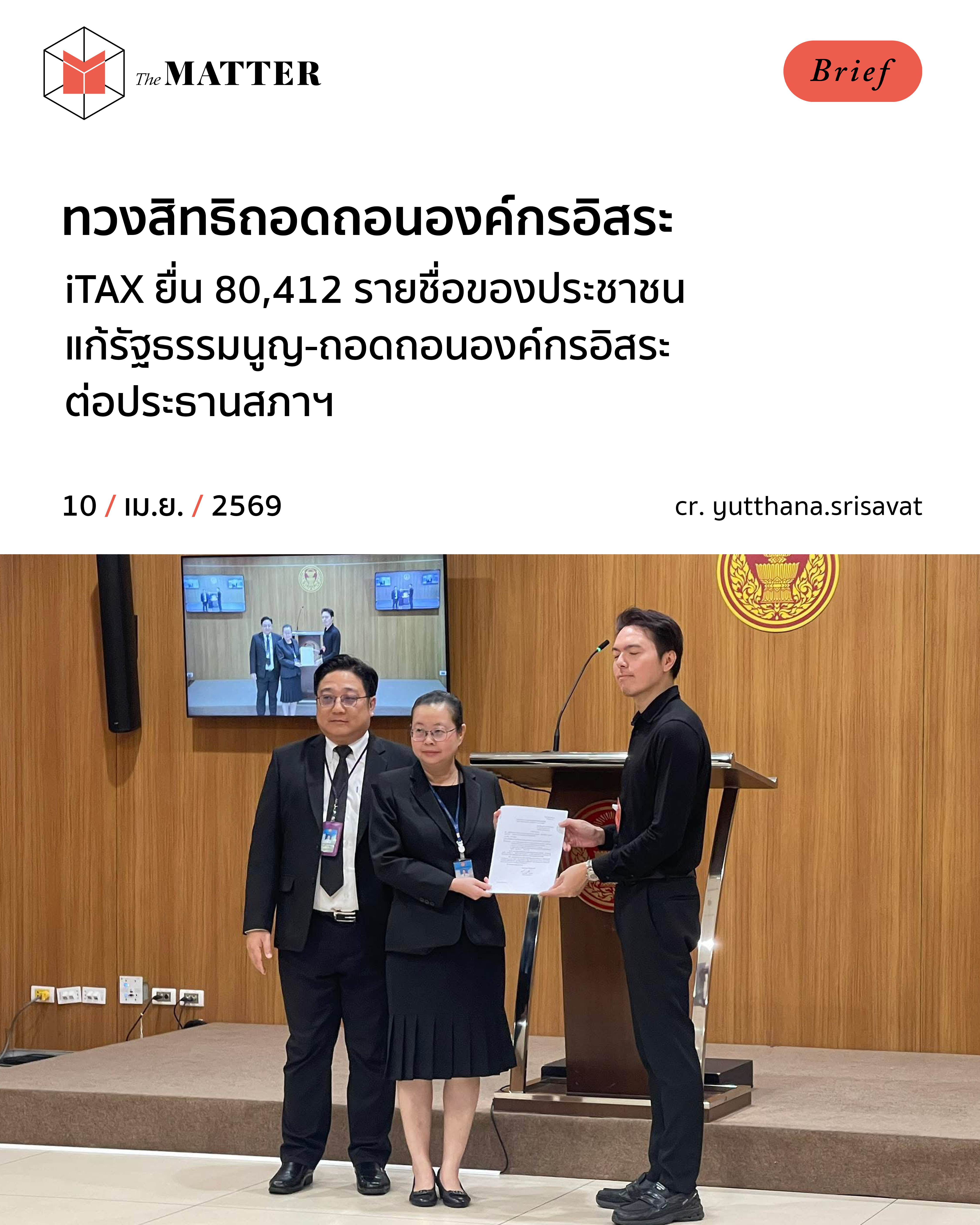 วันนี้ (10 เมษายน 2569) เวลา 10:00 น. ที่รัฐสภา ผศ.ดร.ยุทธนา ศรีสวัสดิ์ ผู้ก่อตั้ง iTAX ได้ยื่นร่างรัฐธรรมนูญแก้ไขเพิ่มเติม (ฉบับที่..) พ.ศ… พร้อมเอกสารลงลายมือชื่อของผู้มีสิทธิเลือกตั้ง 80,412 คน ต่อ โสภณ ซารัมย์ ประธานรัฐสภา โดยมี รัชดาภรณ์ เอี่ยมอนันต์ นิติกรเชี่ยวชาญ รักษาราชการแทนผู้บังคับบัญชากลุ่มงานประสานการเมืองและรับเรื่องราวร้องทุกข์ สำนักงานประธานสภาผู้แทนราษฎร เป็นตัวแทนรับยื่นหนังสือแทน
