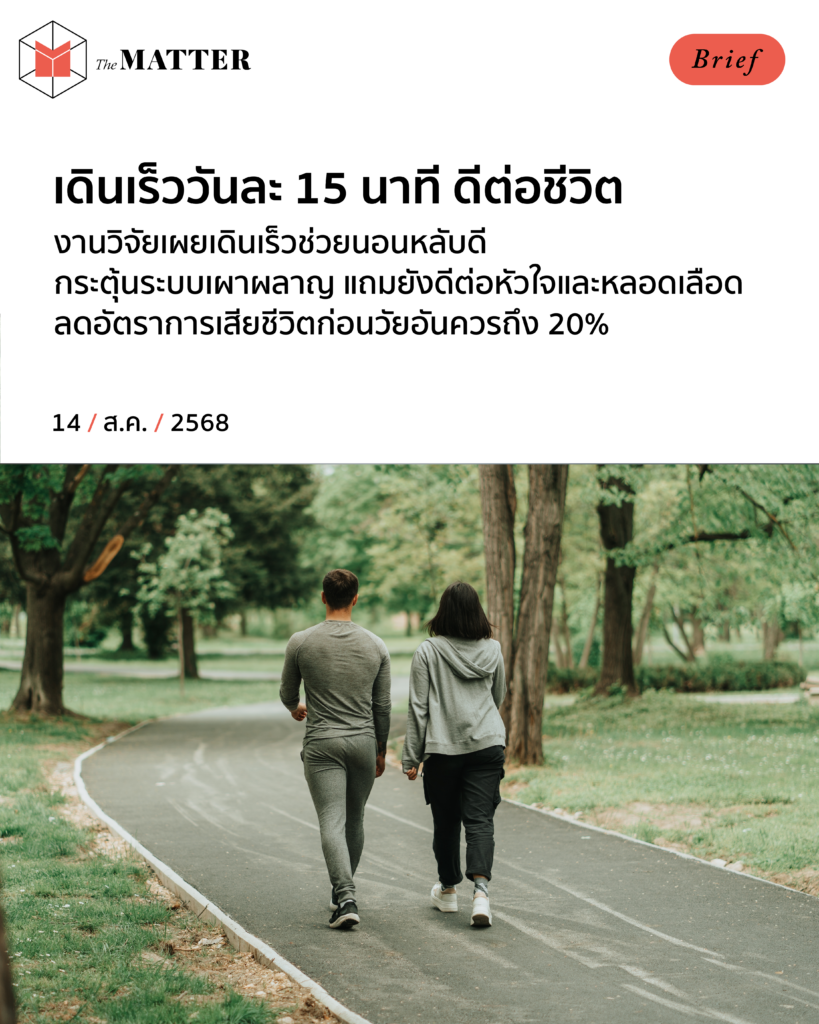 ทั้งนี้ การออกกำลังกายไม่ว่าวิธีไหนก็ล้วนส่งผลดีต่อสุขภาพ แต่การเดินเร็วเพียง 15 นาที ถือเป็นช่วงเวลาที่น้อยและให้ผลลัพธ์ค่อนข้างดี โดยทุกคนสามารถเริ่มทำได้เพียงฝึกเดินเร็วระหว่างไปทำงาน กลับบ้าน หรือหาอะไรกินระหว่างวัน ยิ่งเป็นกิจกรรมที่ง่ายเท่าไหร่ยิ่งดีต่อการฝึกทำให้เป็นนิสัย