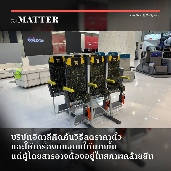 Aviointeriors บริษัทผลิตที่นั่งสำหรับสายการบินอิตาลี ออกแบบวิธีที่จะทำให้ตั๋วมีราคาทั้งถูกลง แถมยังจุคนได้มากขึ้นอีกต่างหาก แต่ผู้โดยสารที่ซื้อตั๋วที่นั่งนี้อาจจะต้องอยู่ในสภาพที่คล้ายกับยืนตลอดการเดินทางเลยน่ะสิ