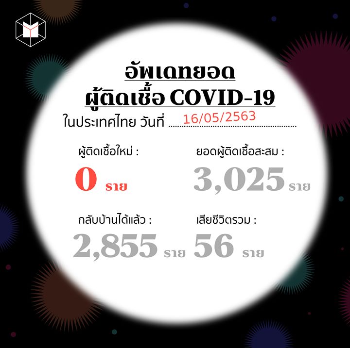 ศูนย์บริหารสถานการณ์โควิด-19 (ศบค.) รายงานตัวเลขผู้ป่วย COVID-19 ประจำวันที่ 16 พฤษภาคม ไม่พบผู้ป่วยรายใหม่ และไม่มีผู้เสียชีวิตเพิ่ม รวมยอดผู้เสียชีวิต 56 ราย รวมกลับบ้านได้แล้ว 2,855 ราย เพิ่มขึ้น 1 ราย และรวมป่วยสะสม 3,025 ราย