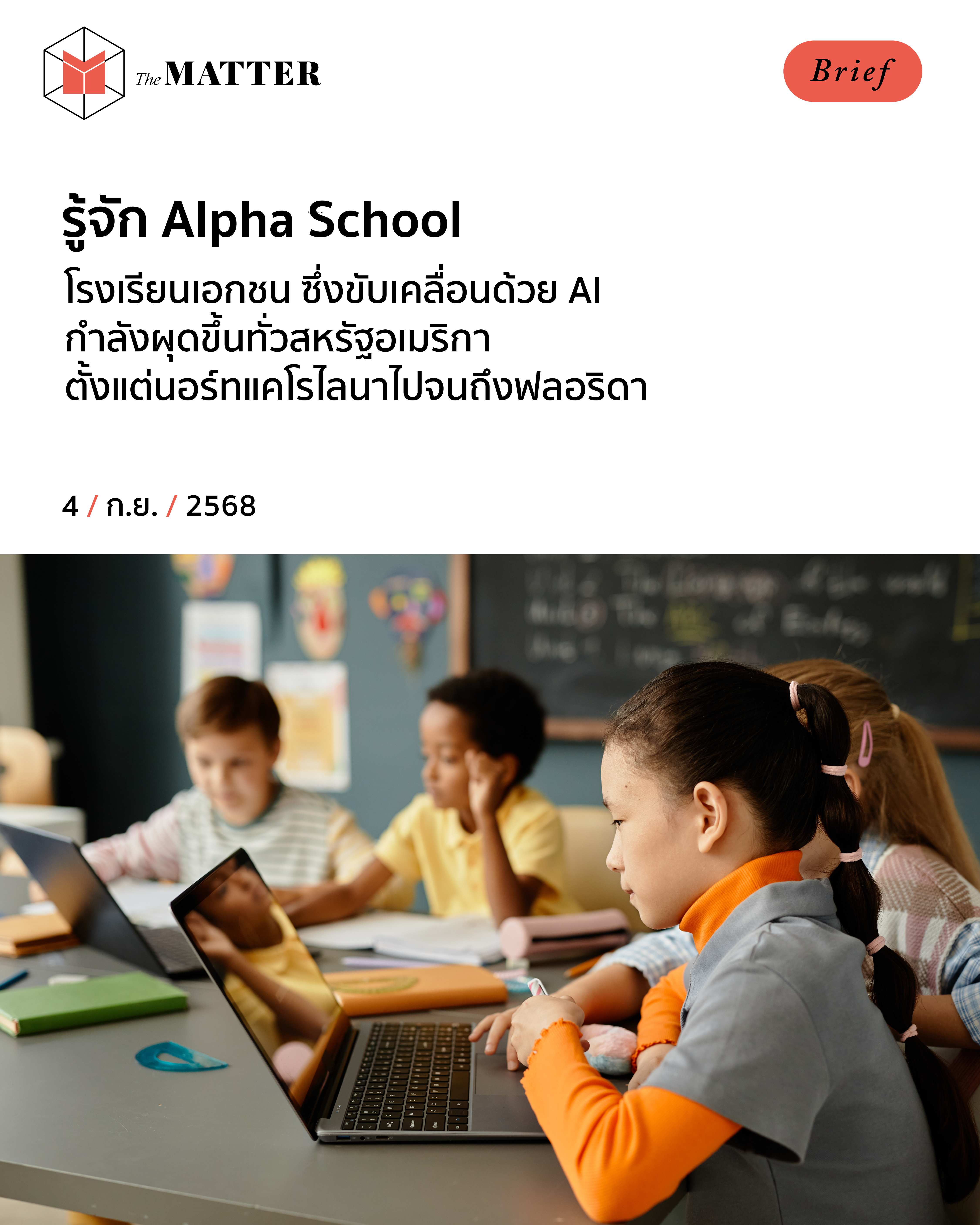 ‘โรงเรียนที่ขับเคลื่อนด้วยปัญญาประดิษฐ์ (AI-Driven School)’ หรือ ‘โรงเรียนอัลฟา (Alpha School)’ เป็นโรงเรียนเอกชนที่มีค่าเล่าเรียนสูง โดยเริ่มต้นที่ 40,000 ดอลลาร์สหรัฐต่อปี (ประมาณ 1.3 ล้านบาท)