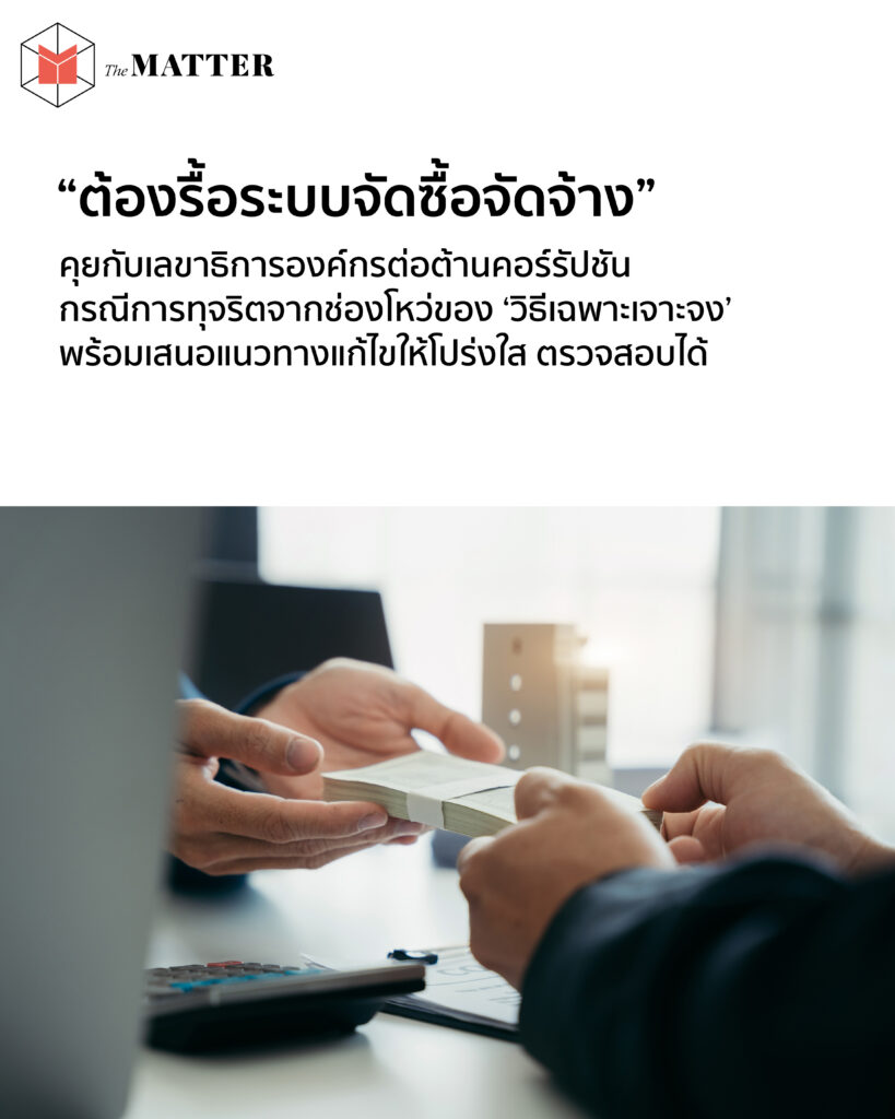 แต่ในขณะเดียวกัน ก็เป็นคำที่เราอาจคุ้นเคยผ่านข่าว ‘ทุจริต’ อย่างการใช้กระบวนการจัดซื้อจัดจ้างบังหน้า แต่เบื้องหลังล็อคมง พร้อมเอื้อผลประโยชน์ให้พวกพ้อง ด้วยกลวิธีมากมาย โดยเฉพาะเมื่อกฎหมายมีเครื่องมืออย่าง ‘การจัดซื้อจัดจ้างโดยวิธีเฉพาะเจาะจง’ คิดเพื่อให้เกิดความยืดหยุ่นในการทำงาน แต่ในขณะเดียวกันก็กลายเป็นช่องว่างให้คนหาผลประโยชน์ได้อีกด้วย