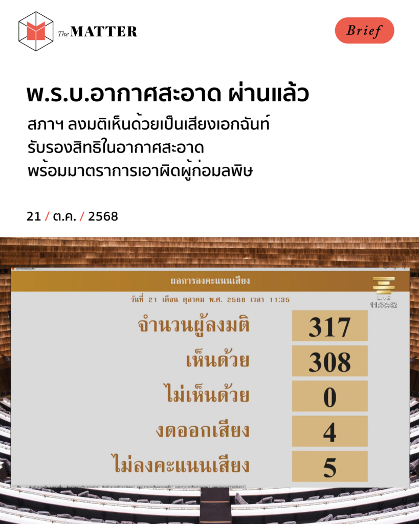 วันนี้ (21 ตุลาคม 2568) สภาผู้แทนราษฎรได้ผ่านการพิจารณาร่าง พ.ร.บ.บริหารจัดการเพื่ออากาศสะอาด หรือ ‘พ.ร.บ.อากาศสะอาด’ ในวาระ 3 โดยลงมติเห็นชอบกฎหมายดังกล่าว 309 เสียง ไม่มีเสียงไม่เห็นด้วย งดออกเสียง 4 เสียง และไม่ลงคะแนน 5 เสียง ก่อนจะส่งให้วุฒิสภาพิจารณาต่อไป