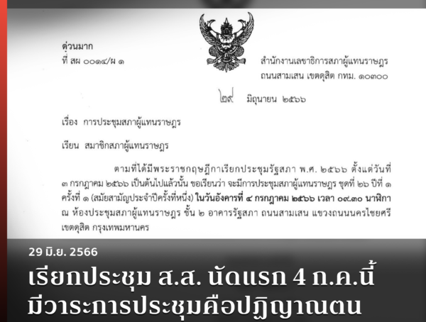 เรียกประชุม ส.ส. นัดแรก 4 ก.ค.นี้ มีวาระการประชุมคือปฏิญาณตน เลือกประธาน-รองประธานสภา