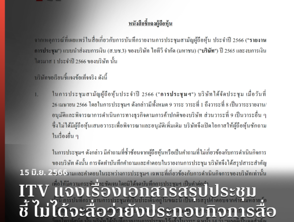 ITV แจงเรื่องเอกสารสรุปประชุม ชี้ ไม่ได้จะสื่อว่ายังประกอบกิจการสื่อ ส่วนงบ 1/2566 เป็นเพียงฉบับร่าง