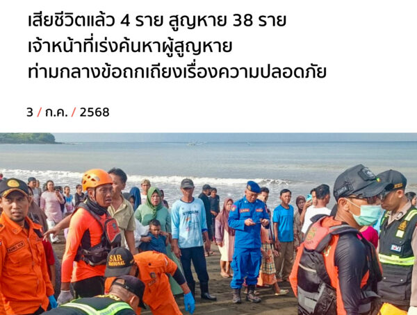 เรือเฟอร์รี่ไปบาหลีล่ม เสียชีวิตแล้ว 4 ราย สูญหาย 38 ราย เจ้าหน้าที่เร่งค้นหาผู้สูญหาย ท่ามกลางข้อถกเถียงเรื่องความปลอดภัย