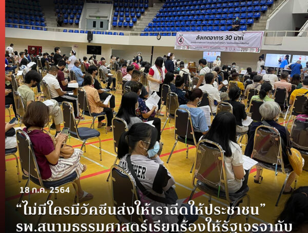 “ไม่มีใครมีวัคซีนส่งให้เราฉีดให้ประชาชน” รพ.สนามธรรมศาสตร์เรียกร้องให้รัฐเจรจากับ AstraZeneca เพื่อนำวัคซีนมาให้คนไทยใช้ก่อน