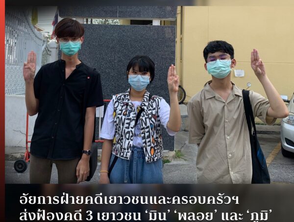 อัยการฝ่ายคดีเยาวชนและครอบครัวฯ ส่งฟ้องคดี 3 เยาวชน ‘มิน’ ‘พลอย’ และ ‘ภูมิ’ จากข้อหาฝ่าฝืน พ.ร.ก.ฉุกเฉิน