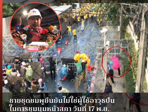 ชายชุดชมพูยืนยันไม่ใช่ผู้ใช้อาวุธปืนในการชุมนุมหน้าสภา วันที่ 17 พ.ย. แค่ไปร่วมชุมนุม แล้วใส่เสื้อกันฝนเหมือนกัน