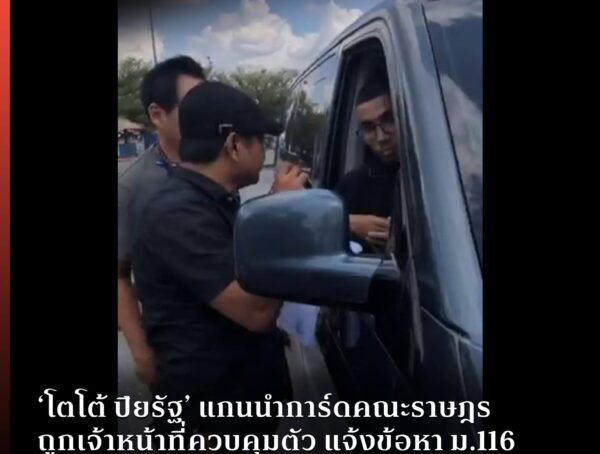 ‘โตโต้ ปิยรัฐ’ แกนนำการ์ดคณะราษฎร ถูกเจ้าหน้าที่ควบคุมตัว แจ้งข้อหา ม.116 และ พรบ.คอมฯ ก่อนนำตัวไปสถานีตำรวจ