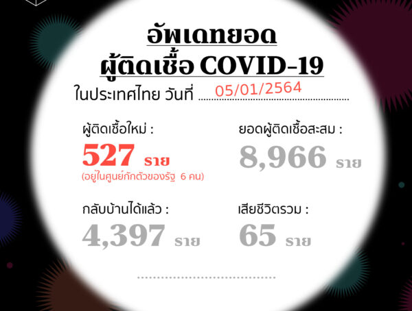 อัพเดทผู้ป่วย COVID-19 ในไทย (1 ม.ค.) ติดเชื้อใหม่ 527 ราย ติดเชื้อในประเทศ 82 ราย และค้นหาเชิงรุกในชุมชน 439 ราย
