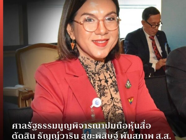 ศาลรัฐธรรมนูญพิจารณาปมถือหุ้นสื่อ ตัดสิน ธัญญ์วาริน สุขะพิสิษฐ์ พ้นสภาพ ส.ส. ขณะที่ 29 ส.ส. ฝ่ายรัฐบาลรอดหมด