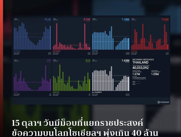 15 ตุลาฯ วันมีม็อบที่แยกราชประสงค์ ข้อความบนโลกโซเชียลฯ พุ่งเกิน 40 ล้าน เพิ่มขึ้นเกือบ 100% เทียบกับวันปกติ