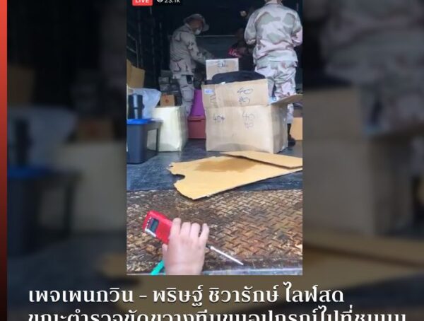 เพจเพนกวิน – พริษฐ์ ชิวารักษ์ ไลฟ์สดขณะตำรวจ ขัดขวางทีมขนอุปกรณ์ไปที่ชุมนุม และยึดของบางส่วน โดยอ้างว่าผิดกฎหมาย