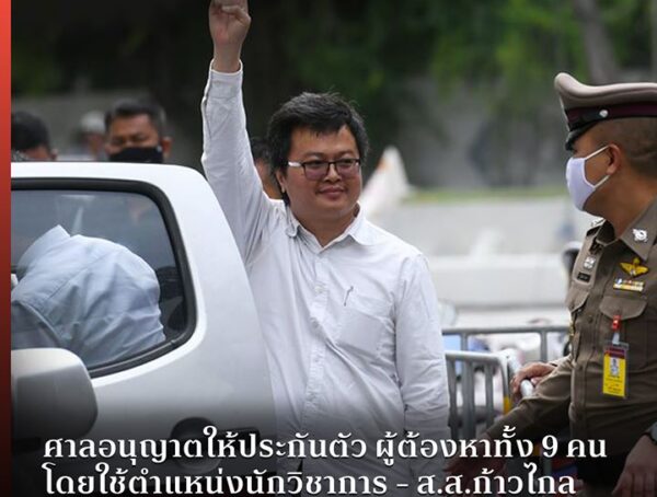 ศาลอนุญาตประกันตัวผู้ต้องหาทั้ง 9 คน โดยใช้ตำแหน่งนักวิชาการ ส.ส. ก้าวไกล และ ส.ส. เพื่อไทย