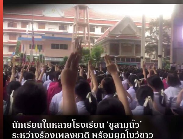 นักเรียนในหลายโรงเรียน ‘ชูสามนิ้ว’ ระหว่างร้องเพลงชาติ พร้อมผูกโบว์ขาว เพื่อแสดงจุดยืน ต่อต้านเผด็จการ