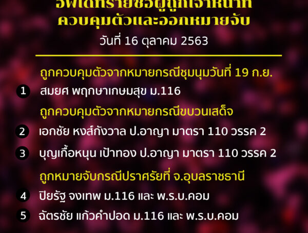 อัพเดทรายชื่อผู้ถูกเจ้าหน้าที่ควบคุมตัวและออกหมายจับ วันที่ 16 ตุลาคม 2563