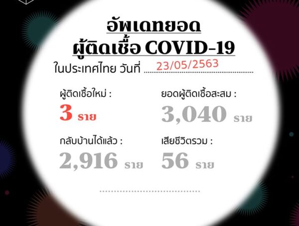 อัพเดทผู้ป่วย COVID-19 ในไทย (22 พ.ค.) ติดเชื้อใหม่ 3 ราย รวมป่วยสะสม 3,040 ราย