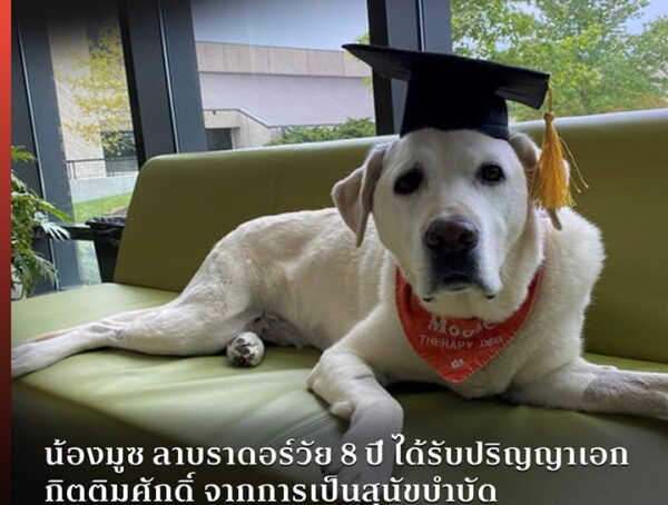 น้องมูซ ลาบราดอร์วัย 8 ปี ได้รับปริญญาเอกกิตติมศักดิ์ จากการเป็นสุนัขบำบัด ที่ช่วยเหลือนักเรียนจำนวนมากในช่วงเวลาลำบาก