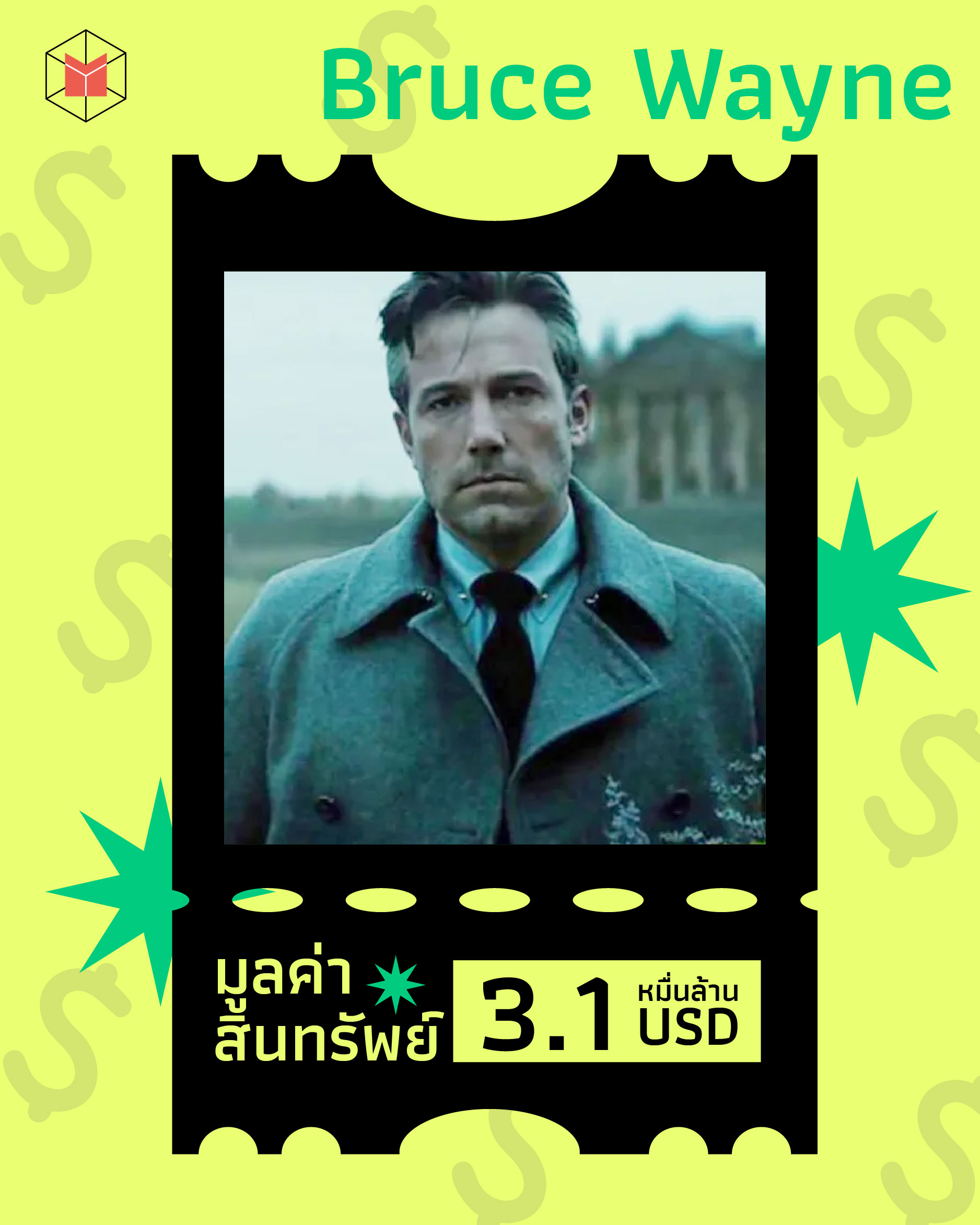 มาถึงมหาเศรษฐีฝั่ง DC กันบ้าง ซึ่งจะเป็นใครไม่ได้นอกจาก ‘บรูซ เวย์น’ ชายที่บอกว่าพลังพิเศษของเขาคือ “ผมรวย” บรูซได้รับมรดกตกทอดเป็นทรัพย์สินทั้งหมดของครอบครัวและการเป็นเจ้าของ Wayne Enterprises หลังจากพ่อแม่ของเขาเสียชีวิต เขาคือพ่อหนุ่มเพลย์บอยที่ออกงานและควงสาวเป็นว่าเล่น แต่ใต้ตาอาจจะคล้ำไปหน่อย เพราะตอนกลางคืนชอบแอบไปเล่นบทอัศวินรัตติกาล