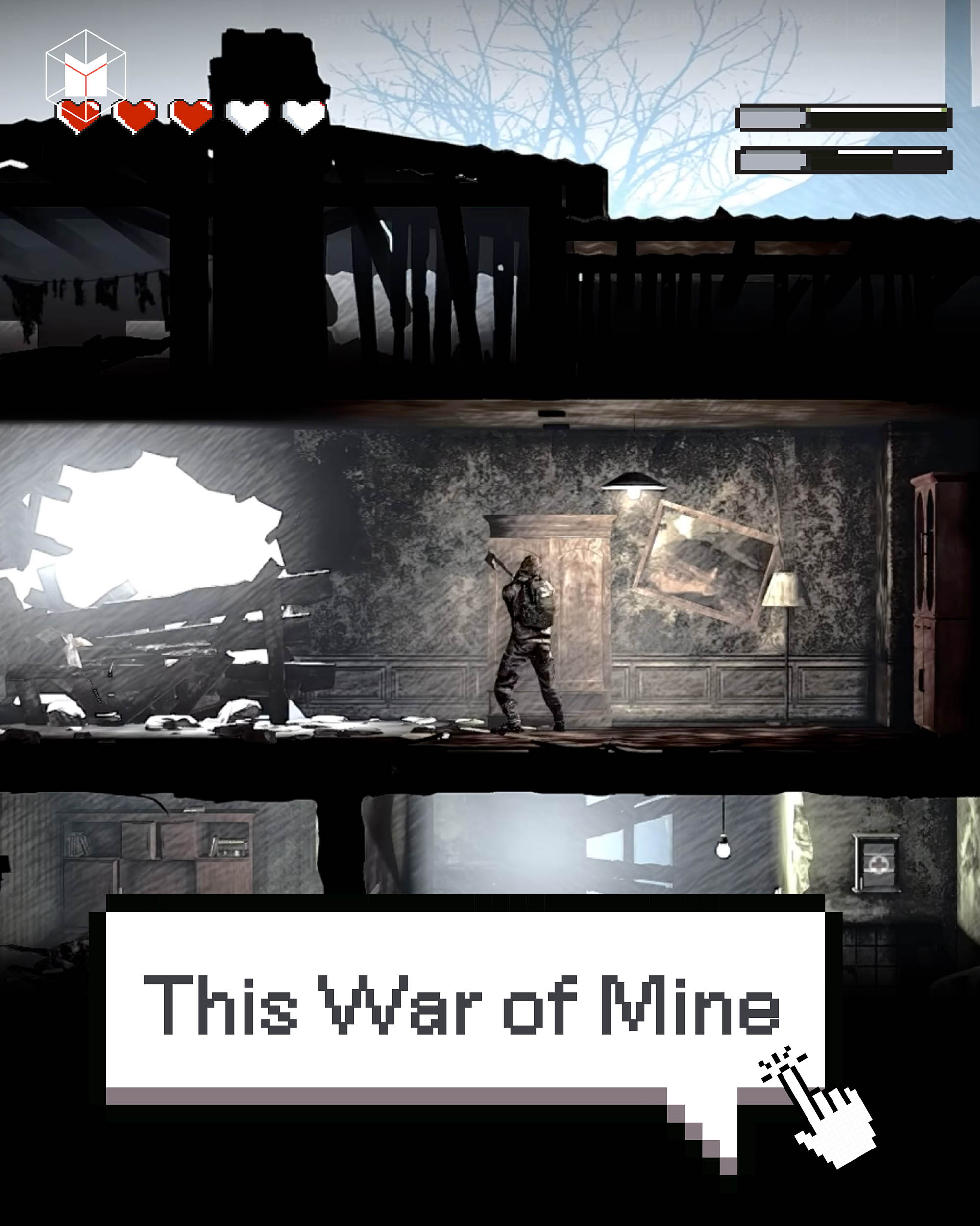 อย่าหวังจะได้เป็นทหารกล้าในเกมนี้ This War of Mine มอบบทบาทให้ผู้เล่นเป็นเพียงพลเรือนที่พยายามจะเอาชีวิตรอดในสงครามอันยืดเยื้อ เป้าหมายคือการพาตัวเองให้ผ่านพ้นไปได้ในแต่ละวัน ที่นี่ไม่มีความหวังใดๆ จะมอบให้ ตอนกลางวันเราออกจากที่พักไม่ได้เพราะมีสไนเปอร์คอยซุ่มยิง มีแค่ตอนกลางคืนที่จะได้ออกไปคุ้ยขยะหาอาหาร ยา และวัสดุอุปกรณ์สำหรับประทังชีวิต
