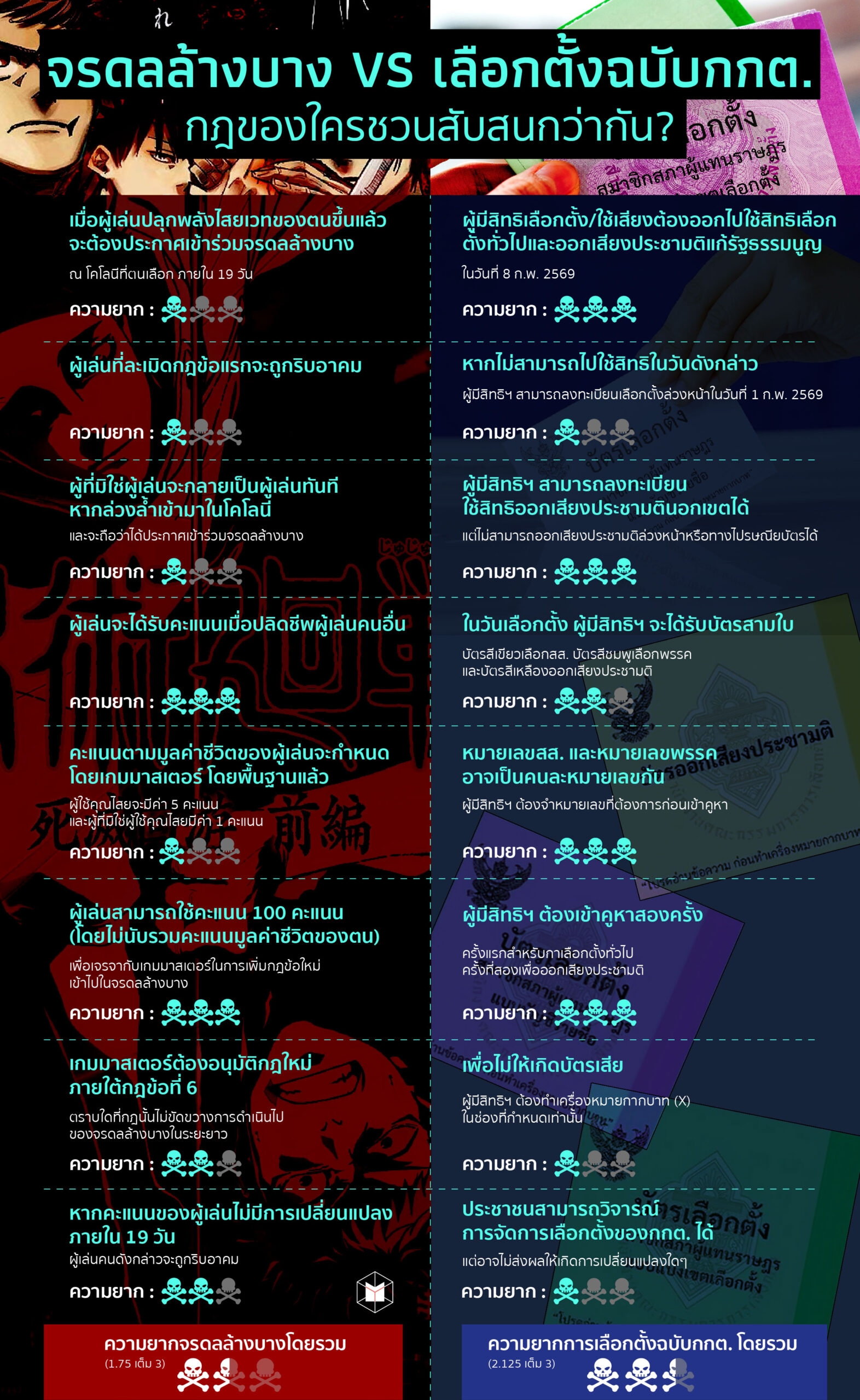 The MATTER จึงลองมาเปรียบเทียบพร้อมให้คะแนนความยากในการทำตามของแต่ละข้อ (คะแนน 1-3 จากน้อยไปมาก) ระหว่างผู้เล่นในจรดลล้างบางกับผู้มีสิทธิใช้เสียงในไทย ใครจะสับสนในกฎที่ตั้งไว้มากกว่ากันล่ะเนี่ย