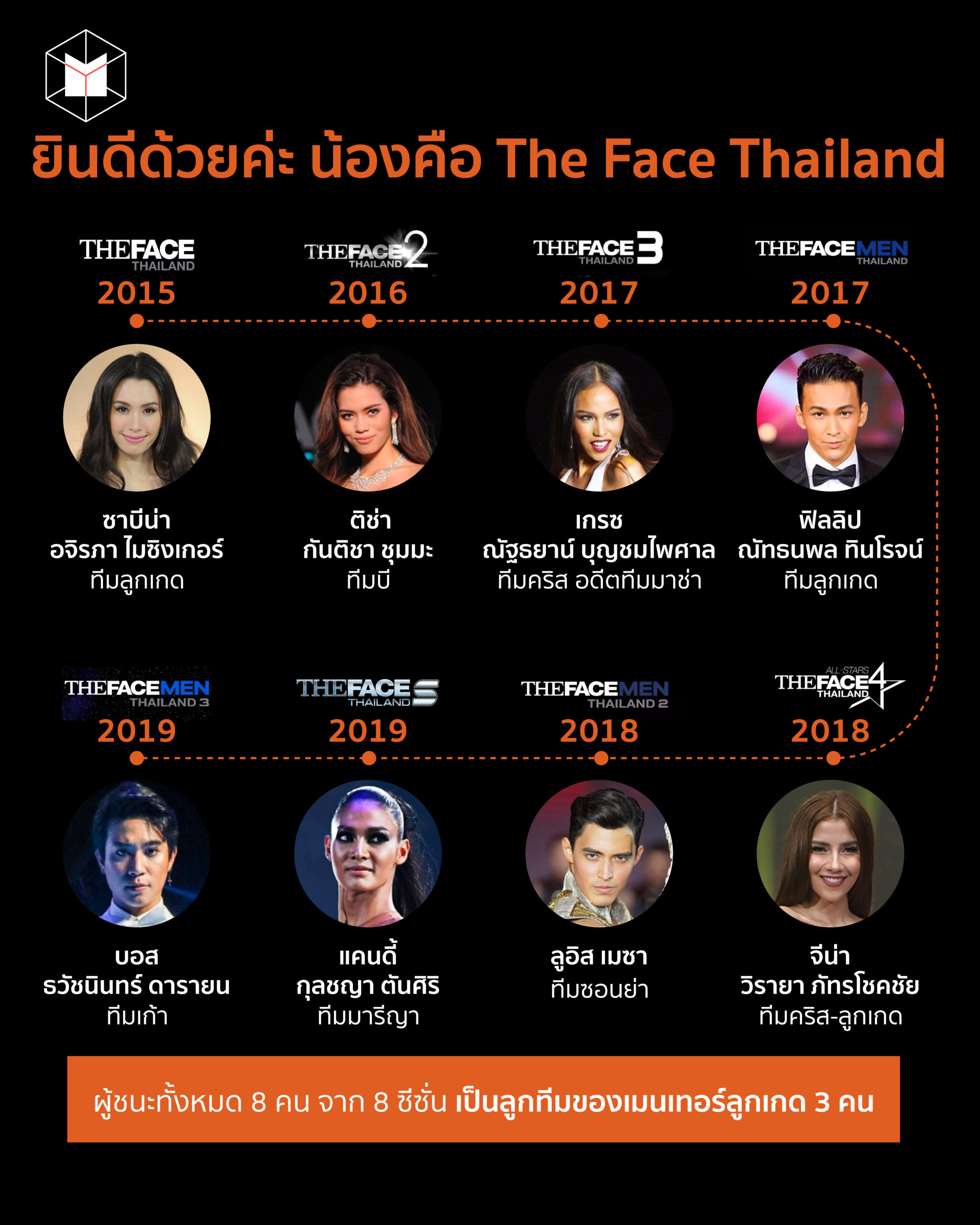พอกางข้อมูลออกมาขนาดนี้แล้ว ก็เป็นอีกครั้งที่เราต้องพูดว่า ในผู้ชนะทั้งหมด 8 คน จาก 8 ซีซั่น เป็นลูกทีมของเมนเทอร์ลูกเกดไปแล้วถึง 3 คนเลยทีเดียว ทั้งใน The Face Thailand ซีซั่น 1, The Face Men Thailand ซีซั่น 1 และ The Face Thailand ซีซั่น 4 All-Stars ร่วมกับเมนเทอร์คริส นี่ล่ะๆ พี่ลูกเกดกินรวบหมด ทั้งเมนเทอร์ ทั้งลูกทีม เมทินี ไม่เคยแพ้ใครเลยจริงๆ