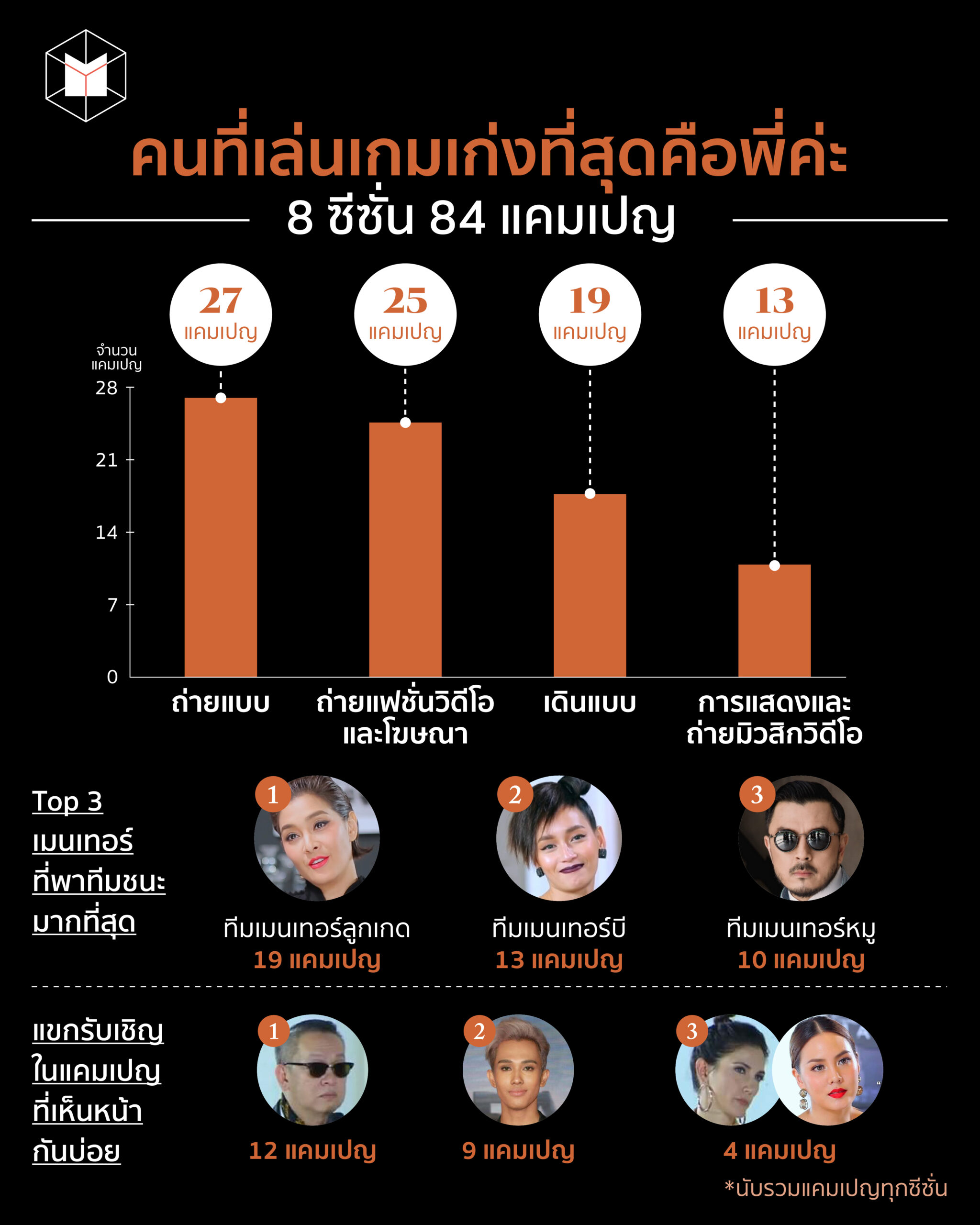 และ 84 แคมเปญ จาก 8 ซีซั่นที่แต่ละทีมฝ่าฝันกันมา เราก็ได้รวบรวมทำเนียมทีมที่ชนะแคมเปญมาให้ทุกคนได้เห็นว่า บัลลังก์แชมป์นี้ก็ยังตกเป็นของ ‘ทีมลูกเกด’ เพราะในจำนวน 5 ซีซั่นที่พี่ลูกเกดมาเป็นเมนเทอร์ เมทินีพาทีมชนะแคมเปญไปมากที่สุดถึง 19 แคมเปญด้วยกันเชียว โดยเป็นการถ่ายแบบไปแล้ว 8 แคมเปญ, เดินแบบ 6 แคมเปญ, ถ่ายแฟชั่นวิดีโอและโฆษณา 4 แคมเปญ และการแสดงมิวสิกวิดีโออีก 1 แคมเปญ รู้แบบนี้แล้วใครจะเหมาะสมกับคำว่า ‘สตรอง’ เท่าพี่ลูกเกดอีกคะเนี่ย ถ่ายแบบก็รู้ใจตากล้อง เดินแบบก็มีลูกเล่นไม่จำเจ ถ่ายวิดีโอก็ไม่มีหวั่น แบบนี้คนอื่นก็ทำไม่ได้แน่ ต้องลูกเกดเท่านั้น