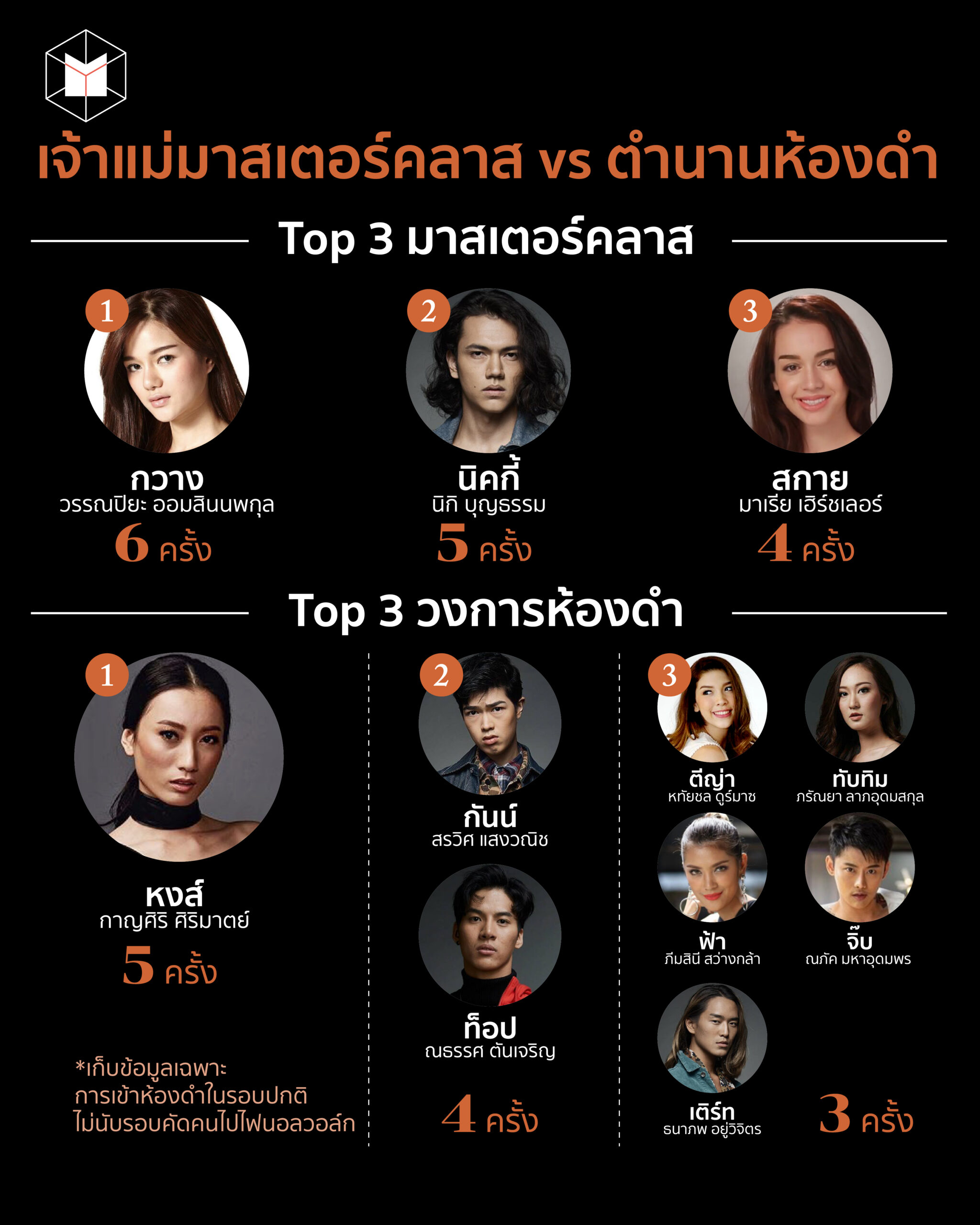แล้วก็มาถึงจุดที่ต้องหลั่งน้ำตาเมื่อการ ‘เข้าห้องดำ’ มาเยือน ใครจะอยู่ ใครจะไป วัดกันที่ตรงนี้แหละ แม้ว่าจะไม่ได้เป็นคนที่อ่อนที่สุดในทีม แต่เมื่อมันเป็นเกมแล้วเมนเทอร์ส่งเราเข้าไป สิ่งที่ทำได้ก็คงมีแต่การยืนหยัดเพื่อตัวเอง บางคนเข้าออกห้องดำบ่อยจนนึกว่าเป็นบ้านหลังที่ 2 ก็มี เอาล่ะ งั้นเรามาดูกันสักหน่อยว่า ตำนานแห่งห้องดำจะมีใครกันบ้าง (แต่งานนี้ขอเก็บข้อมูลเฉพาะห้องดำในรอบปกติ ไม่นับรอบที่คัดคนไปไฟนอลวอล์กนะ)