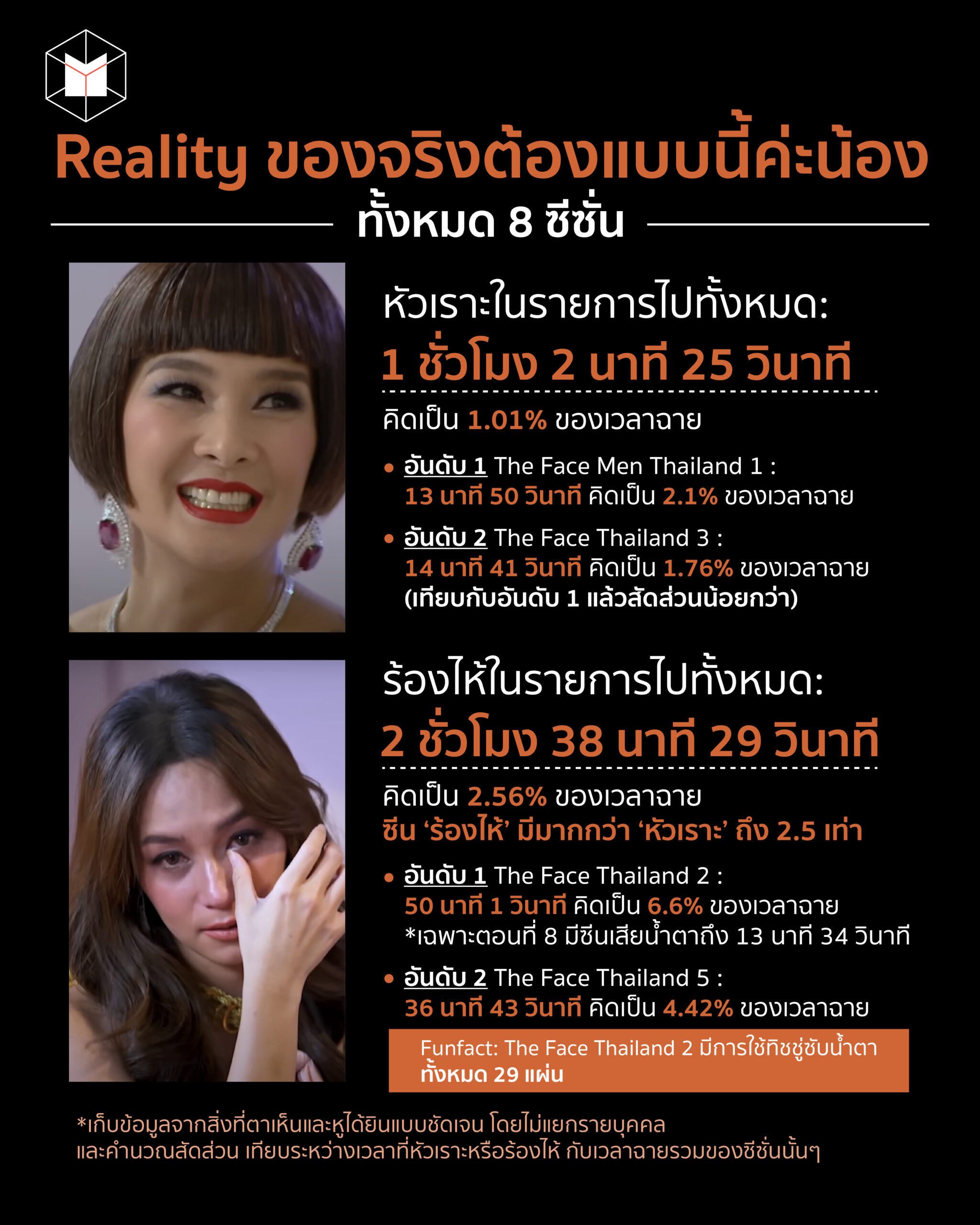 หลังจากนับนิ้วกันมาตลอดทั้ง 8 ซีซั่นก็พบว่า ทุกคนใช้เวลาหัวเราะในรายการไปทั้งสิ้น 1 ชั่วโมง 2 นาที 25 วินาที คิดเป็น 1.01% ของเวลาฉายในซีซั่นนั้น และใช้เวลาร้องไห้ไป 2 ชั่วโมง 38 นาที 29 วินาที คิดเป็น 2.56% ของเวลาฉายในซีซั่นนั้น เรียกได้ว่าซีน ‘ร้องไห้’ มีมากกว่า ‘หัวเราะ’ ถึง 2.5 เท่าเลย ฮือออ (แต่ขอกระซิบอีกทีนะว่า เราเก็บข้อมูลจากสิ่งที่ตาเห็นและหูได้ยินแบบชัดเจน โดยไม่แยกรายบุคคลจ้ะ)