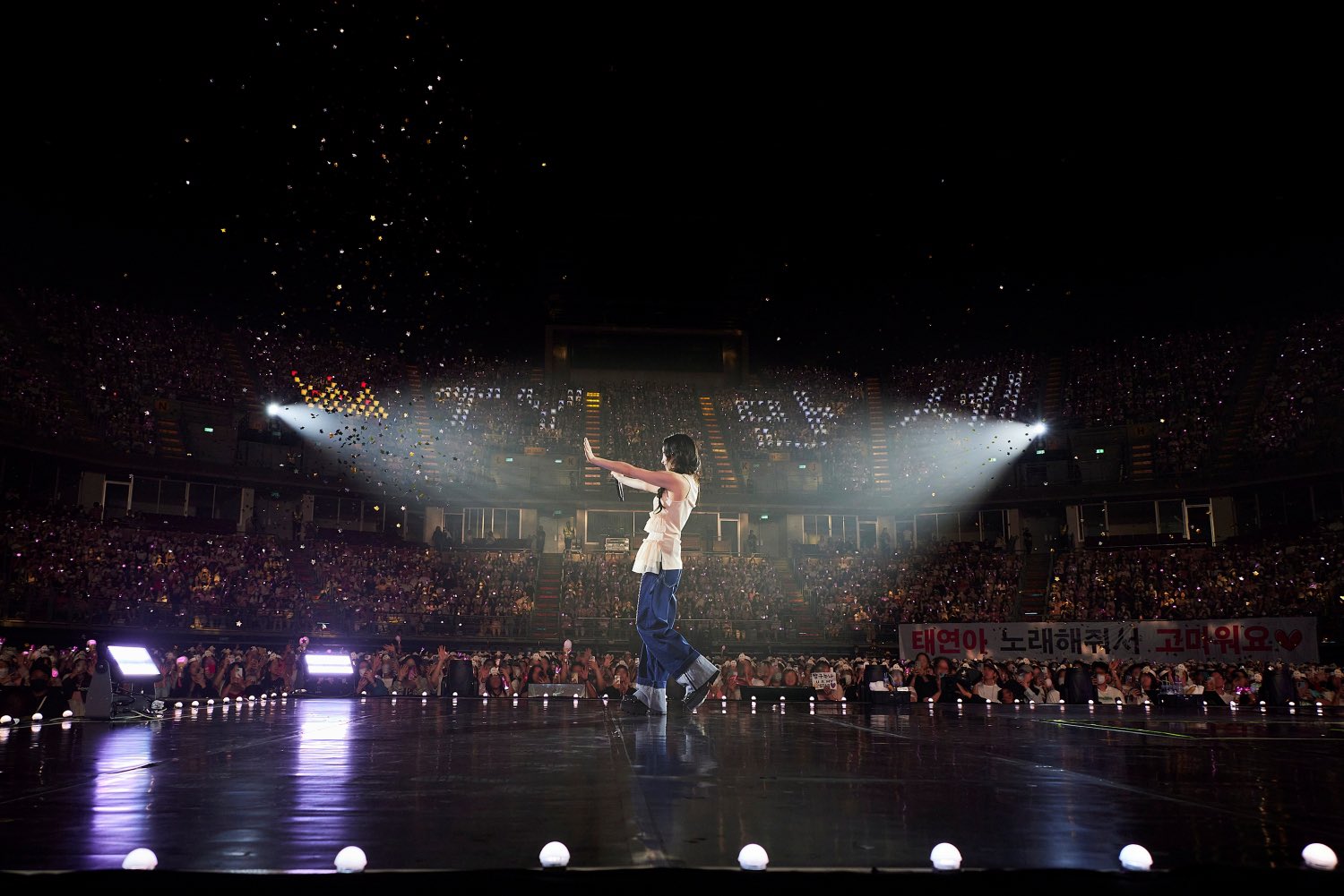 ในด้านโปรดักชั่นก็อลังการทีเดียว เว็บ Naver ระบุข้อมูลว่า คอนเสิร์ตพี่แทในไทยมีโปรดักชั่นเดียวกับที่เกาหลี โดยไม่ได้ลดทอนอะไรไปเลย ไม่ว่าจะเป็นเวที 3 ชั้น, จอ LED ยาว 46 เมตร สูง 10 เมตร, สายพานเลื่อนยาว 6 เมตร, ลิฟต์ 7 ตัว, เครื่องยิงเลเซอร์ 14 ตัว, แท่งไฟแบบเปลี่ยนสีอัตโนมัติ, ม่านกึ่งโปร่งแสงยาว 13 เมตร ไปจนถึงพลุกระดาษ (confetti) 8 แบบ ซึ่งงานนี้ยิงพลุกระดาษบ่อยมาก แถมกระดาษเหล่านั้นยังถูกเขียนเป็นข้อความต่างๆ ด้วยลายมือของแทยอนด้วย แต่เนื่องจากเรานั่งอยู่บัตรดอย กระดาษมาไม่ถึง จึงไม่ได้มีส่วนร่วมใดๆ ฮือ…