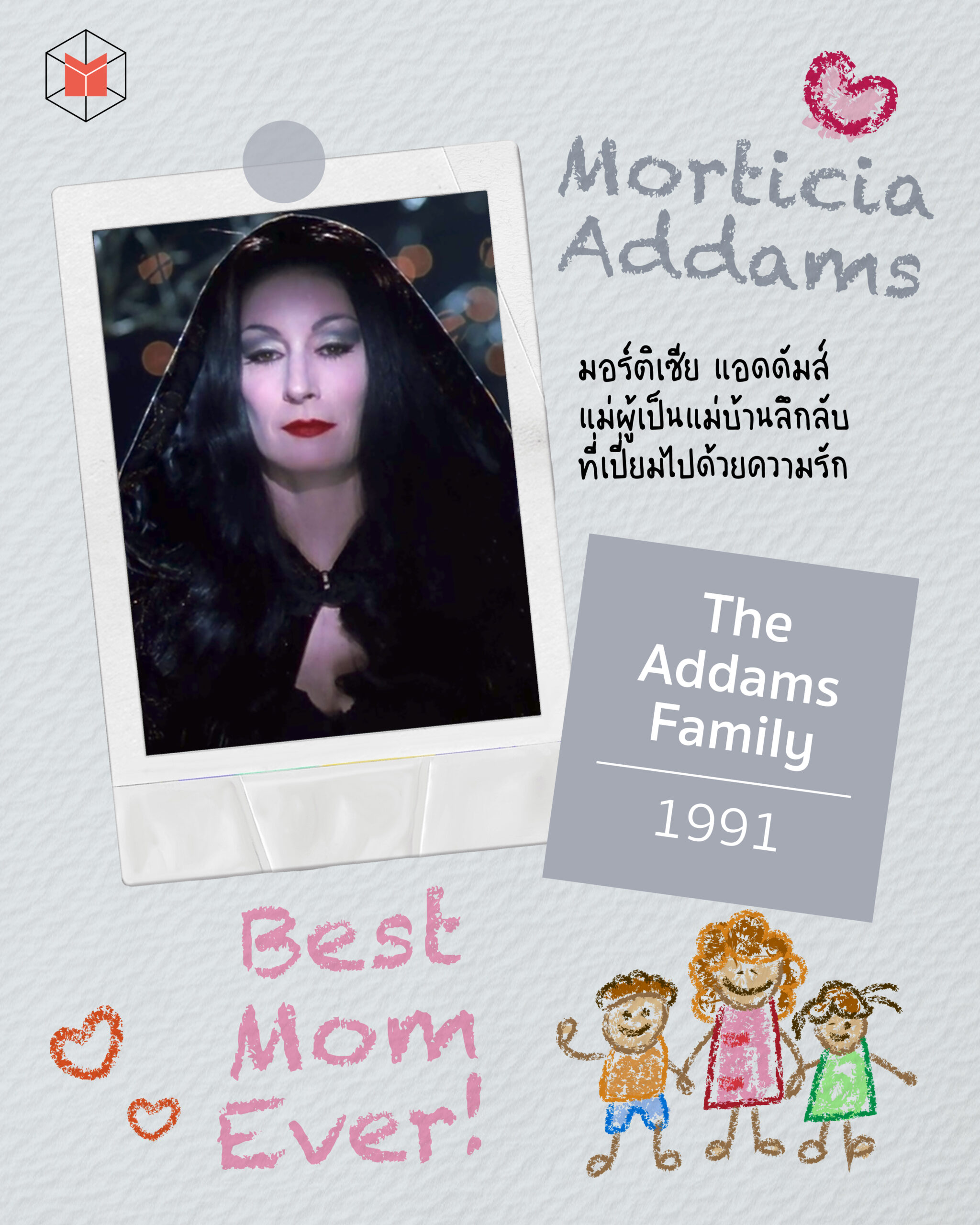 อีกหนึ่งคุณแม่สุดเก๋ที่ไม่พูดถึงไม่ได้ คงเป็น มอร์ติเซีย แอดดัมส์ เธอไม่ใช่คุณแม่ที่คอยจู้จี้ หรือประคบประหงมลูกเกินไป แต่เป็นคุณแม่ที่ยังคงความเซ็กซี่ ความต้องการ และความปรารถนาแบบผู้หญิงไว้อย่างครบถ้วน โดยไม่จำเป็นต้องปกปิดเพียงเพราะเธอมีลูกอย่าง เวนส์เดย์ และ พักส์ลีย์ แล้ว