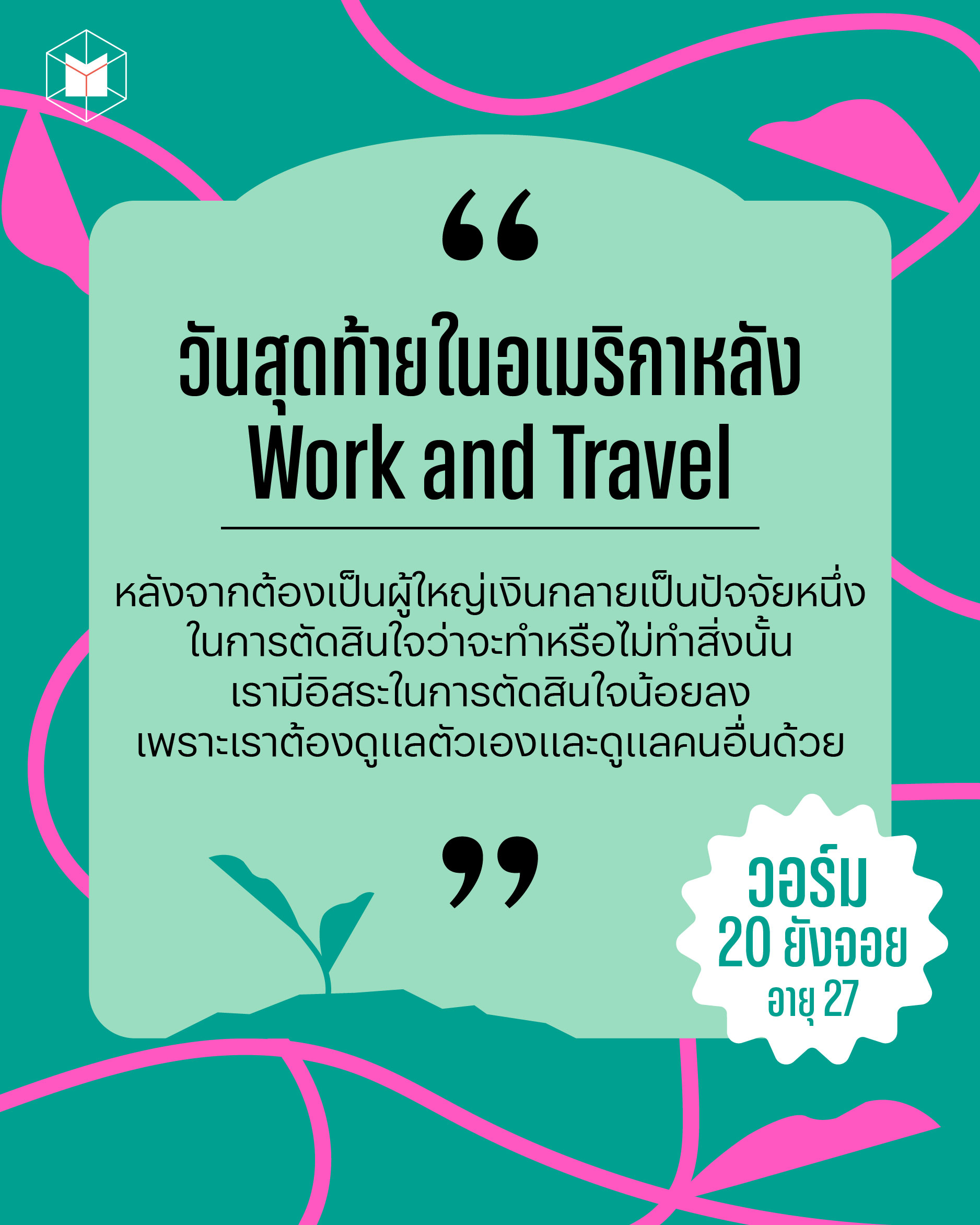 เราไป Work and Travel หลังเรียนจบ แล้ววันสุดท้ายก่อนกลับไทย ช่วงที่พระอาทิตย์ตก เป็นวินาทีที่เราต้องยอมรับความจริงว่าเราไม่ใช่วัยเรียนอีกแล้ว หลังจากนี้เราจะต้องก้าวสู่วัยทำงาน แม้เราจะรู้มาเสมอว่าเงินเป็นสิ่งสำคัญ แต่ก่อนหน้านั้นเราไม่ได้ตัดสินใจสิ่งต่างๆ ด้วยเงิน แต่หลังจากต้องเป็นผู้ใหญ่ เงินกลายเป็นปัจจัยหนึ่งในการตัดสินใจว่าจะทำหรือไม่ทำสิ่งนั้น เรามีอิสระในการตัดสินใจน้อยลง เพราะเราต้องดูแลตัวเองและดูแลคนอื่นด้วย ถ้าเราตอนเด็กมาเจอเราตอนนี้ก็คงบอกว่า โตขึ้นนายก็เจ๋งเหมือนกันนะเนี่ย ถ้ามีเวลาอย่าลืมสนุกกับการ์ตูนทั้งวันเหมือนเขาด้วยนะ เพราะเราในวัยผู้ใหญ่ไม่สามารถสนุกเหมือนเขาได้แล้ว