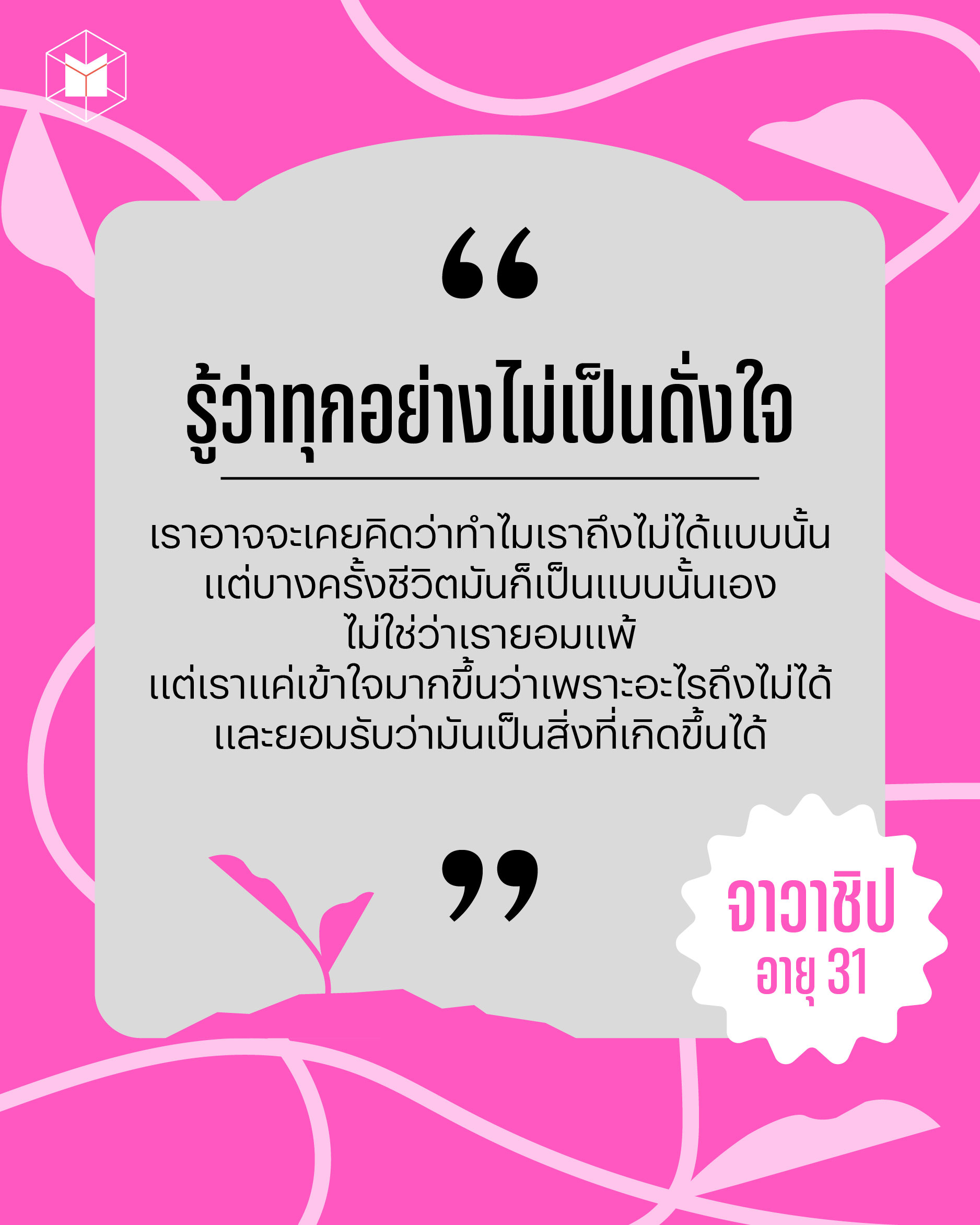 เราอาจจะเคยคิดว่าทำไมเราถึงไม่ได้แบบนั้น แต่บางครั้งชีวิตมันก็เป็นแบบนั้นเอง ไม่ใช่ว่าเรายอมแพ้ แต่เราแค่เข้าใจมากขึ้นว่าเพราะอะไรถึงไม่ได้ และยอมรับได้ว่ามันเป็นสิ่งที่เกิดขึ้นได้ ตอนเด็กเรายอมรับไม่ได้เลย สมมติบอกว่า วันนี้บ่าย 2 ไปกินไอติมกัน ถึงเวลาพ่อไม่ว่าง จะไม่เข้าใจเลยว่าทุกคนมีธุระของตัวเองหรือความกะทันหันมันเกิดขึ้นได้ เราเพิ่งมาเข้าใจช่วงอายุ 27-28 นี้เอง จนรู้สึกว่าถ้าสิ่งไหนสมหวังก็ถือว่าลงล็อคไป แต่ถ้าไม่ได้ก็เป็นจังหวะชีวิตที่จะไม่ได้แล้วกัน เราไม่จำเป็นต้องไปด่า ไปทวงเอาคำตอบเหมือนเมื่อก่อนแล้ว