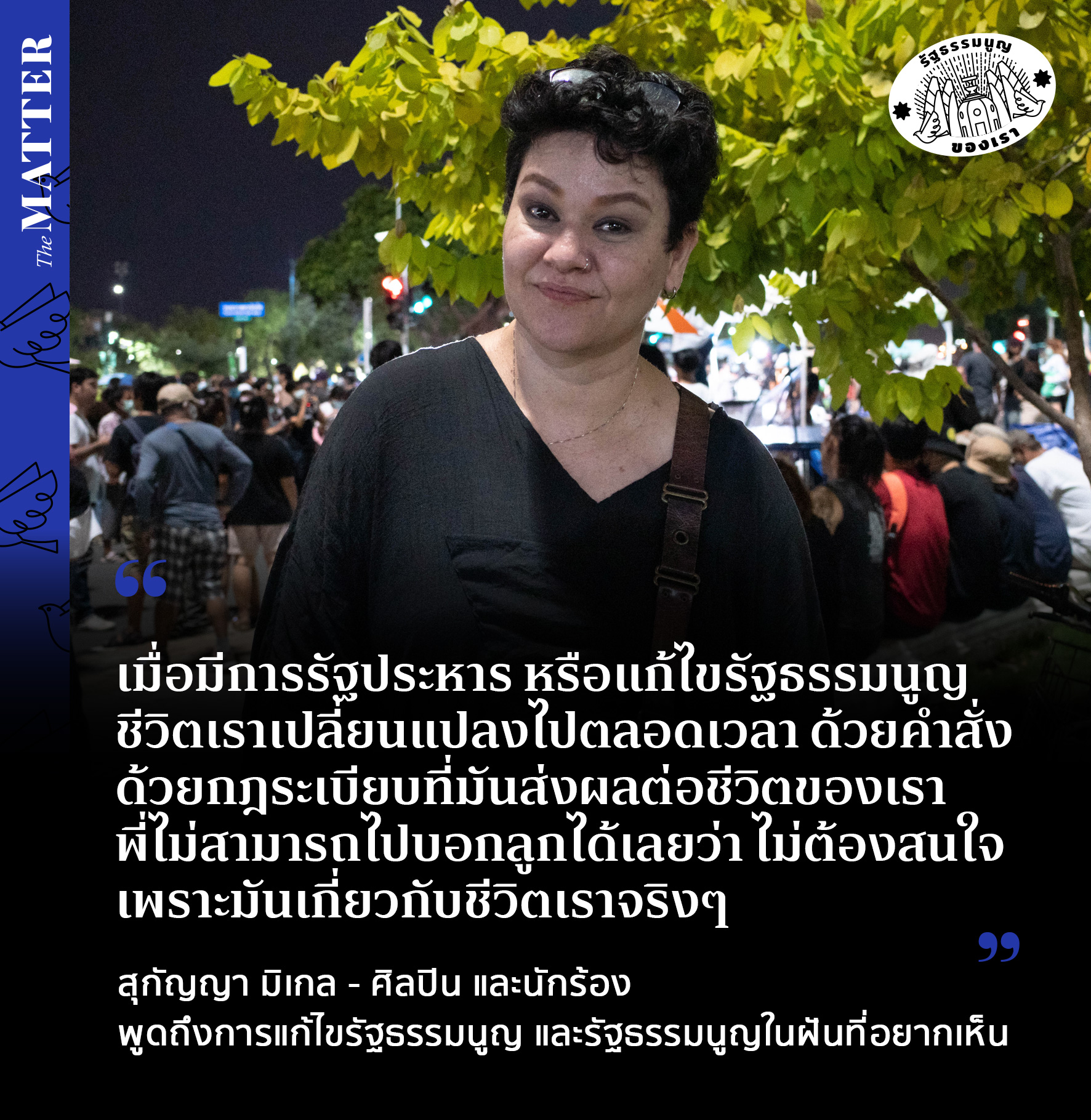 ขณะที่วันนี้ ในสภามีการพิจารณาประเด็นการแก้ไขรัฐธรรมนูญ ซึ่งต้องติดตามกันว่า จะมีการถกเถียง และพูดคุยถึงทิศทางแก้ไขอย่างไร ในระหว่างการชุมนุมใหญ่ #19กันยาทวงอำนาจราษฎร The MATTER ได้พูดคุยกับ สุกัญญา มิเกล ศิลปิน และนักร้องในยุค 90 ถึงความเห็นของเธอ ในฐานะประชาชนคนหนึ่งที่ผ่านการประกาศใช้รัฐธรรมนูญมาหลายฉบับว่า คิดเห็นอย่างไรกับประเด็นการแก้ไขรัฐธรรมนูญ