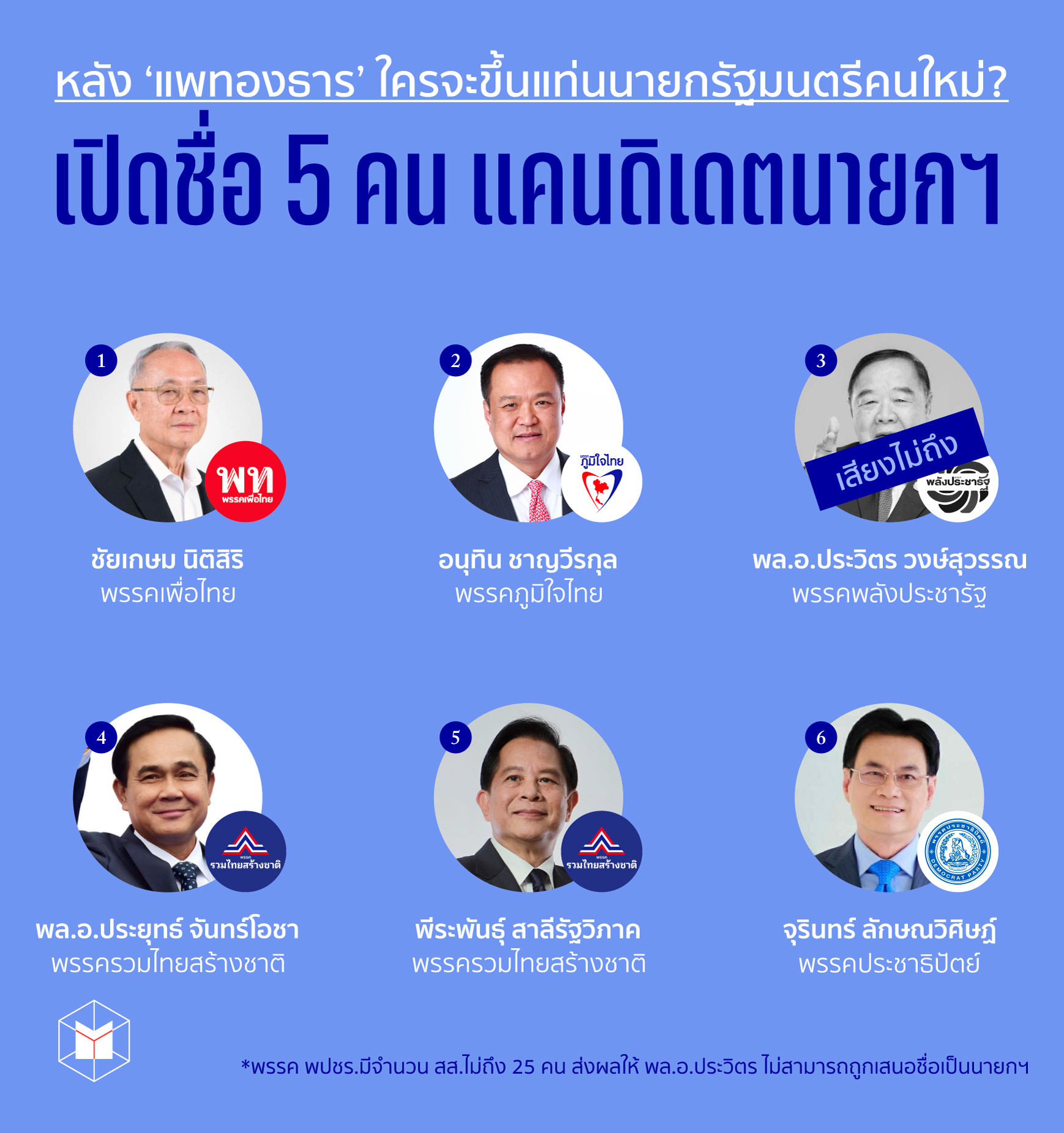 เท่ากับว่าผู้ที่อาจจะมาทำหน้าที่แทนแพทองธาร จะมีทั้งหมด 5 คน ไม่ใช่ 6 คน เนื่องจากพรรคพลังประชารัฐ มี สส. เหลือไม่ถึง 25 คน จึงไม่สามารถเสนอบุคคลในบัญชีรายชื่อคือ พล.อ.ประวิตร เป็นนายกฯ ได้ เพราะรัฐธรรมนูญ มาตรา 159 กำหนดไว้ว่า ในการโหวตเลือกผู้นำของประเทศคนใหม่ พรรคการเมืองของแคนดิเดตต้องมี สส.ไม่น้อยกว่า 5 เปอร์เซ็นต์ ของ สส.ทั้งหมดที่มีของสภา หรือ 25 คนขึ้นไป