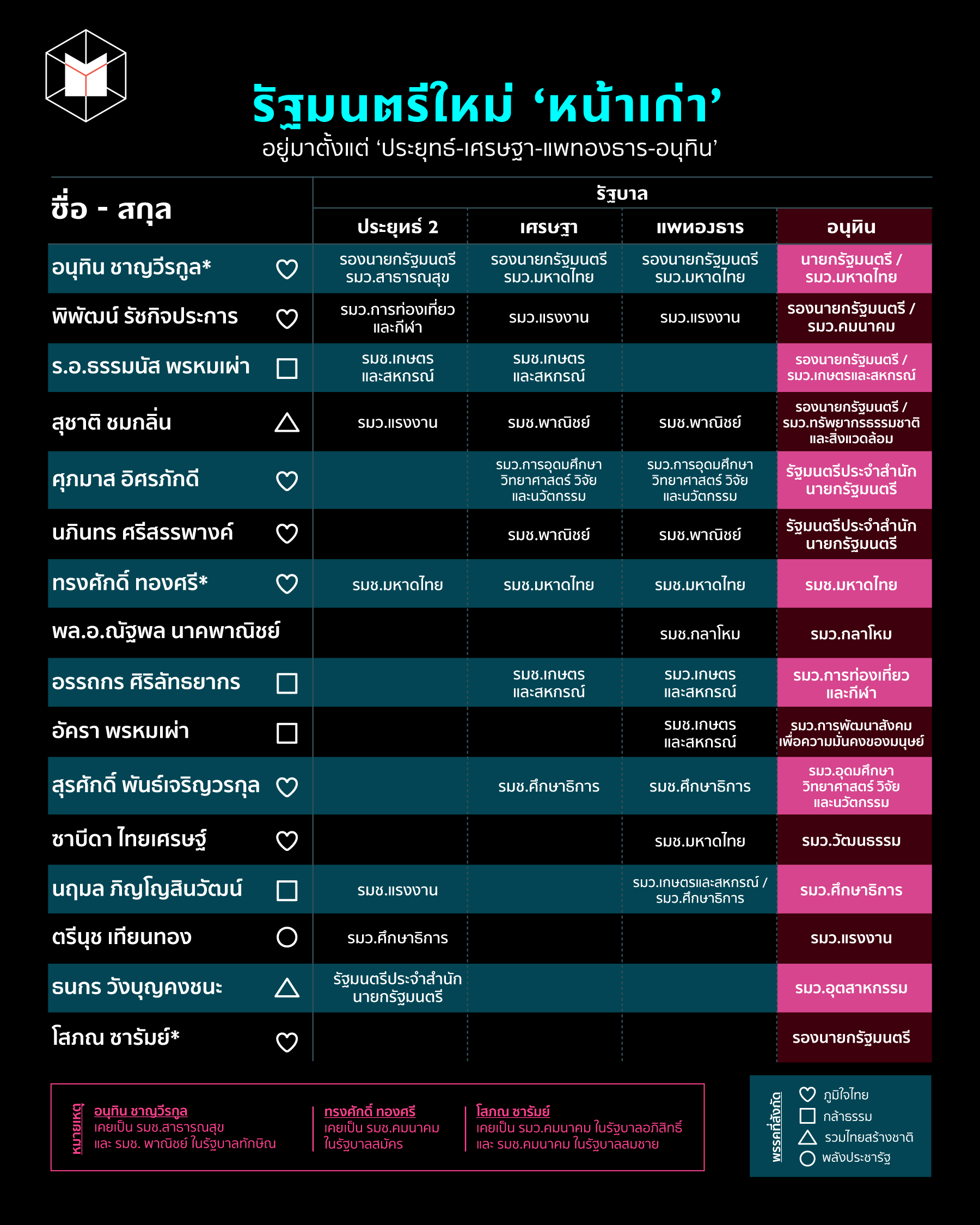 อีกหนึ่งความหน้าคุ้นของรัฐมนตรีชุดนี้ ไม่ใช่แค่คนที่ได้รับตำแหน่งรัฐมนตรีติดต่อกันเรื่อยมา แต่ยังมีรัฐมนตรีบางส่วนที่อาจเคยรับตำแหน่งไปแล้วในสมัยรัฐบาลประยุทธ์-เศรษฐาหรือรัฐบาลในอดีต แต่อาจไม่ได้ไปต่อในรัฐบาลแพทองธารที่ผ่านมา และได้กลับมานั่งเก้าอี้อีกครั้งในสมัยอนุทิน ดังนี้